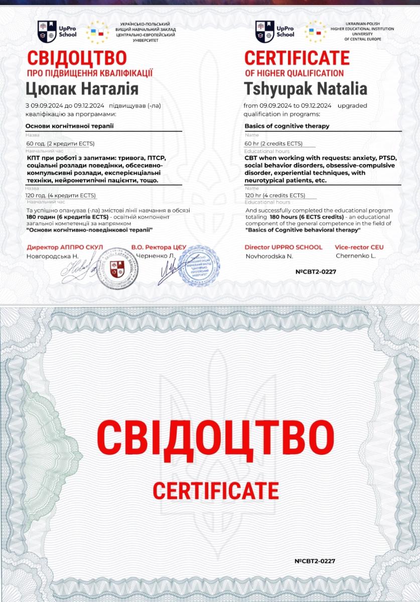 - Сертифікат Свідоцтво ПС2301-13 Психосоматика для психологів та психотерапевтів з 2023 року