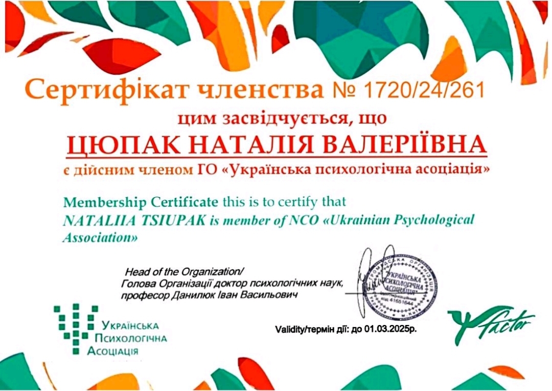 - Сертифікат Використання Арт-терапії у психологічному консультуванні дітей різних вікових груп з 2024 року