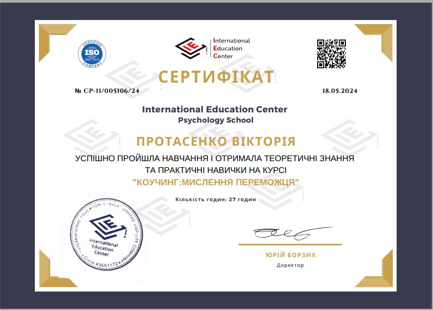 - Сертифікат Когнітивно - поведінкова терапія з 2023 року