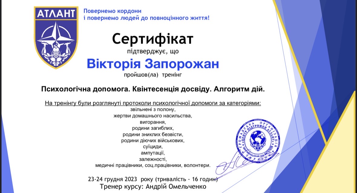 • Сертифікат Диплом « Психотерапт узалежнень» з 2022 року