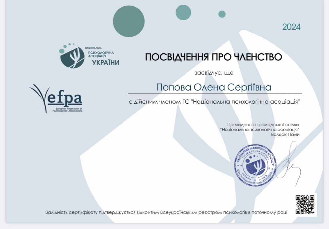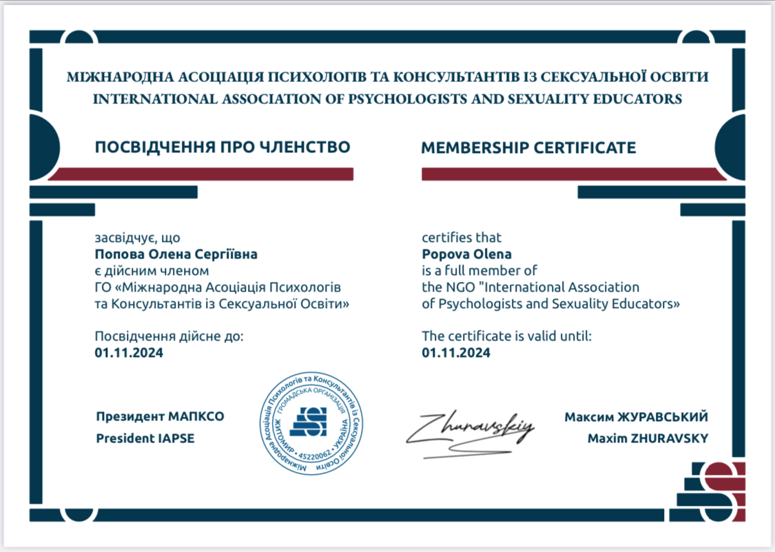 - Дійсний Член міжнародної асоціації психологів та консультантів з сексуальної освіти