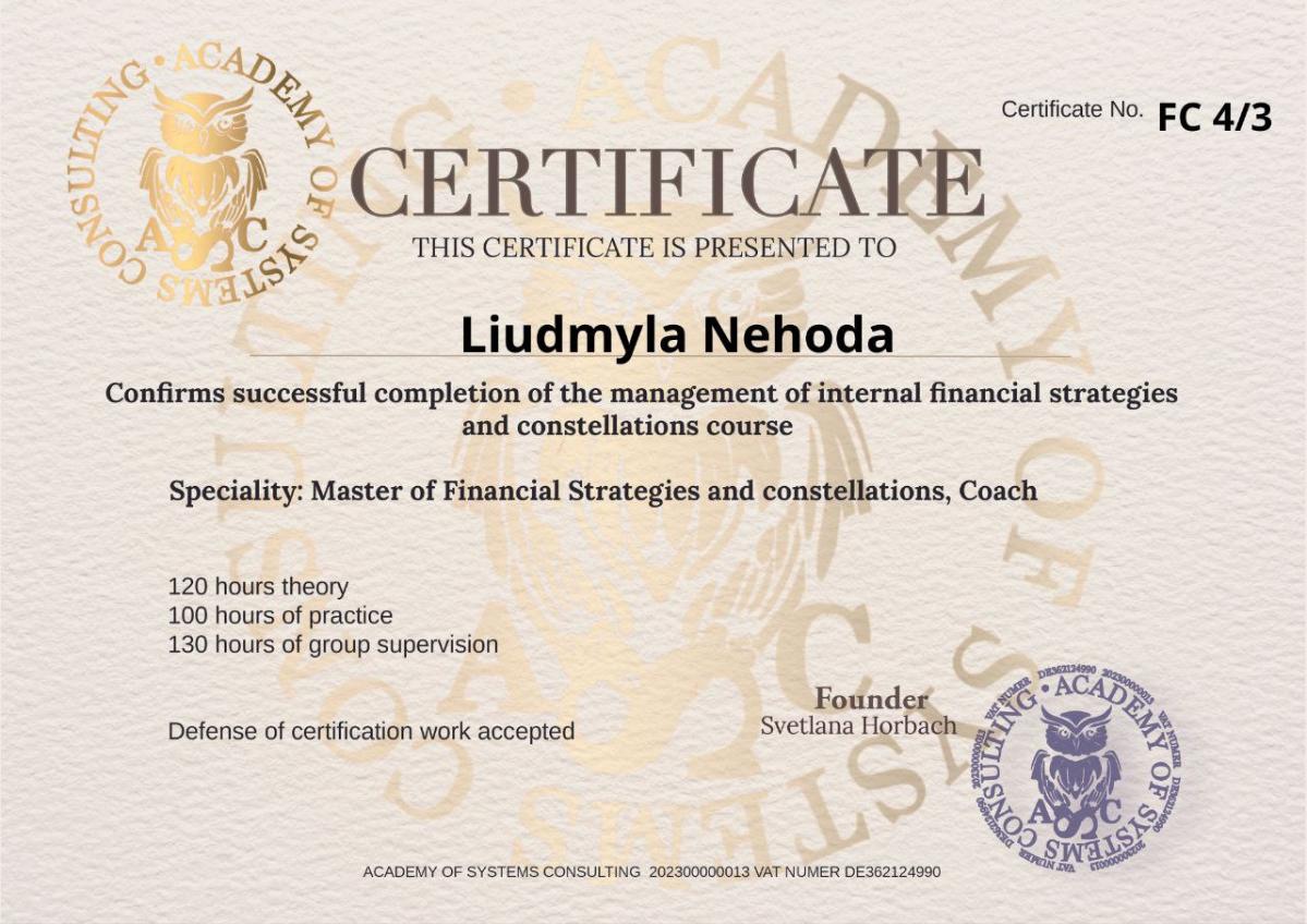 У 2018 році закінчила базовий курс з Позитивної психотерапії Н. Пезішкіана, що дало мені змогу надавати психологічну допомогу людям.