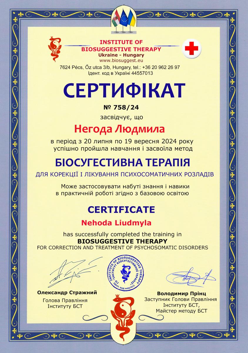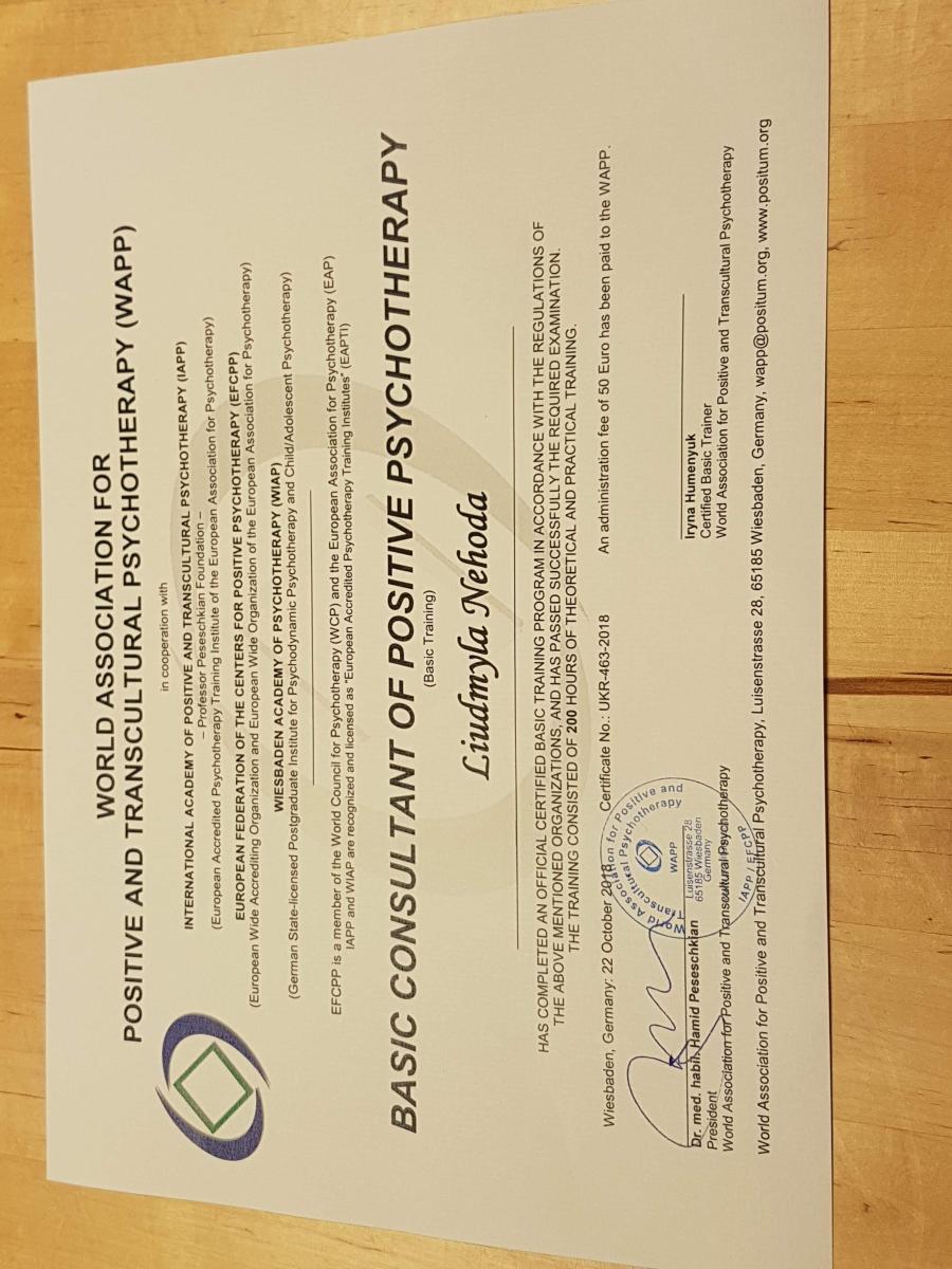 - Сертифікат Консультант в методі позитивної психотерапії з 2018 року