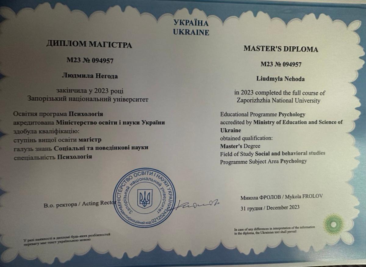 Я магістр психології з досвідом більше 4-х років. Навчалася у Запорізькому національному університеті.