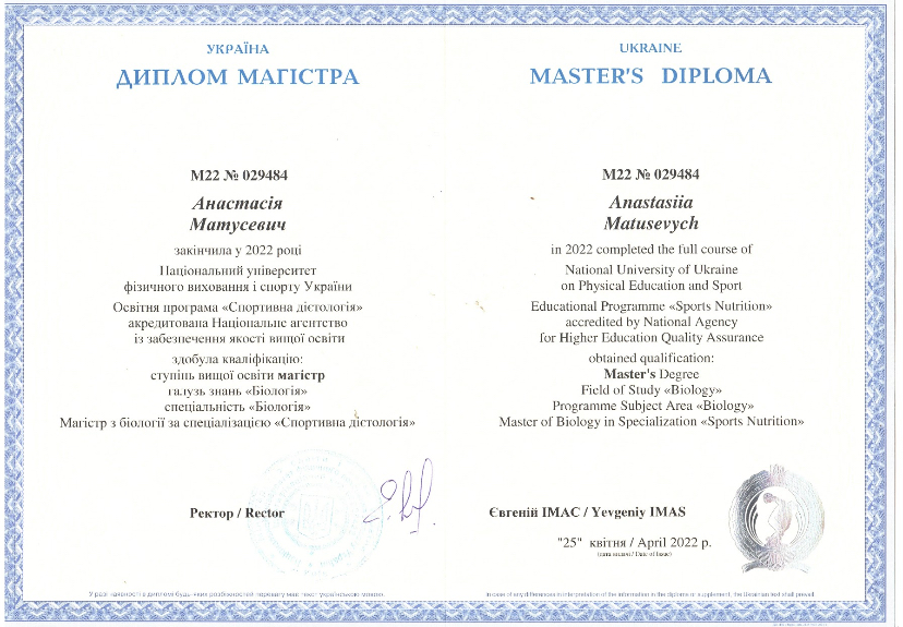 Маю закінчену вищу освіту в УДУ Драгоманова за спеціальністю «Психологія», а також в НУФВСУ за спеціальністю «Спортивна дієтологія».