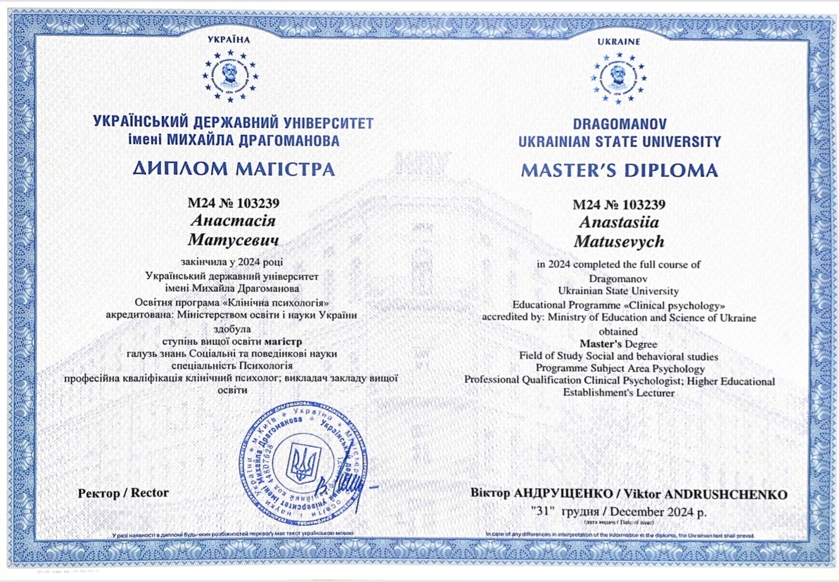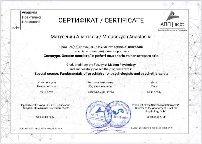 - Сертифікат Основи психіатрії в роботі психологів та психотерапевтів з 2024 року