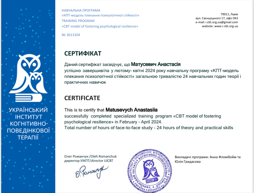 - Сертифікат КПТ-модель плекання психологічної стійкості з 2024 року