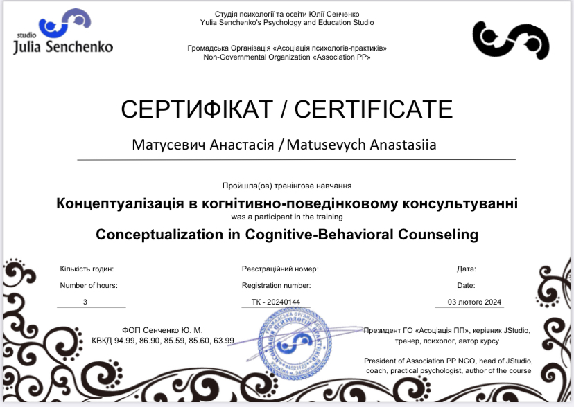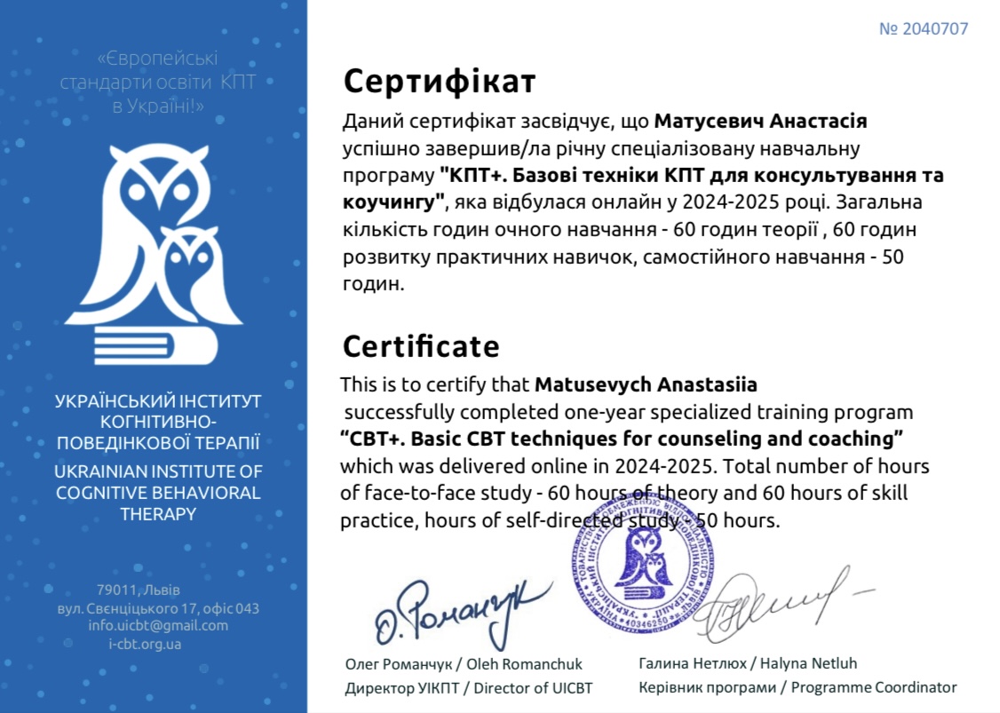 - Сертифікат Основи когнітивно-поведінкової терапії з 2022 року