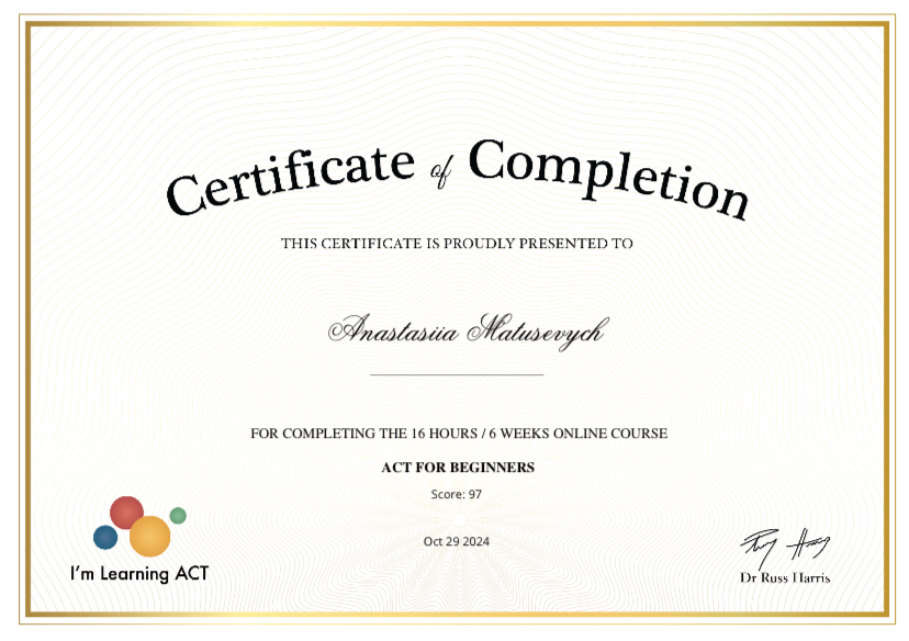 Вітаю! Я Анастасія, психолог консультант, практикую в методі класичного КПТ та ACT (терапія прийняття й зобов’язання).