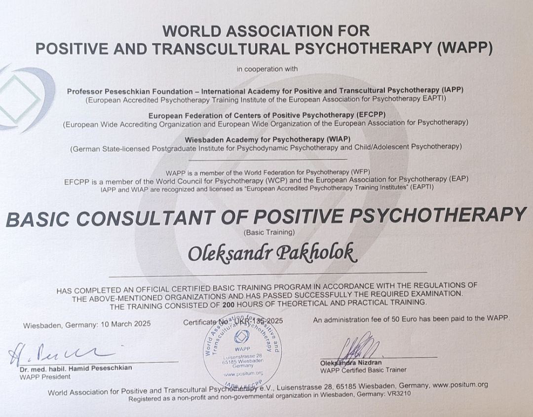 - Сертифікат Духовна психотерапія у сучасному світі з 2025 року