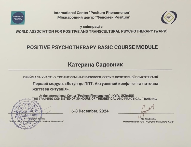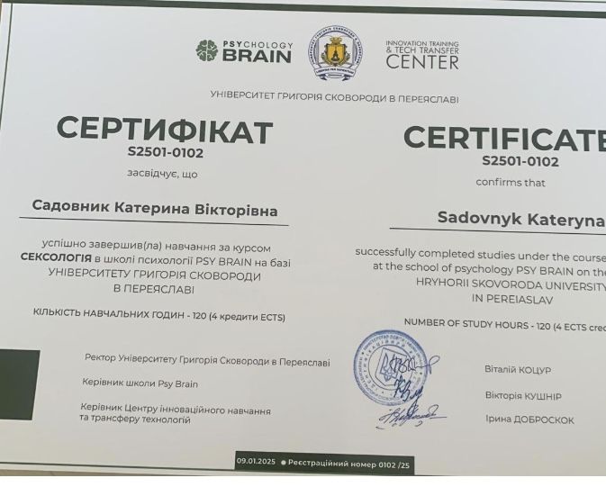- Сертифікат Робота з ПТСР та травмуючим досвідом з 2024 року