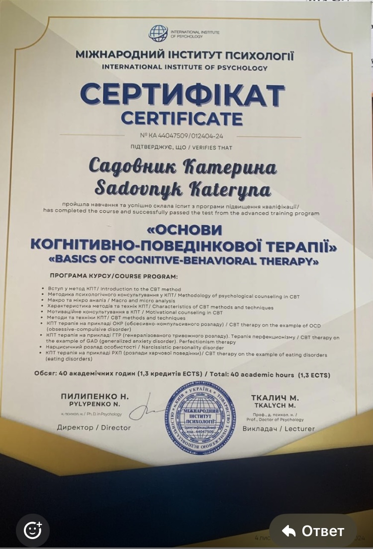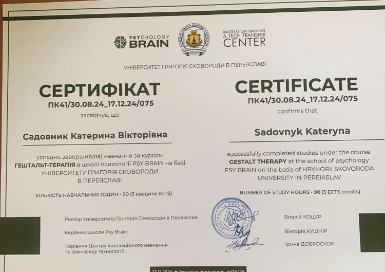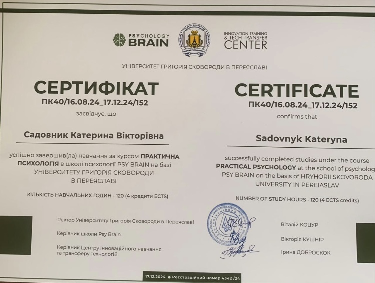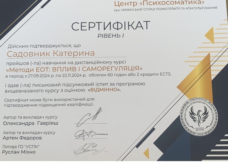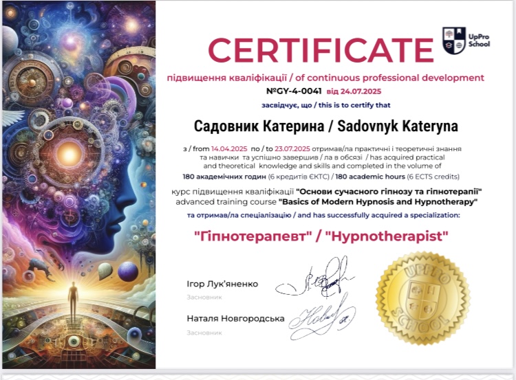 - Сертифікат Практична гіпнотерапія та єріксонівський гіпноз з 2024 року