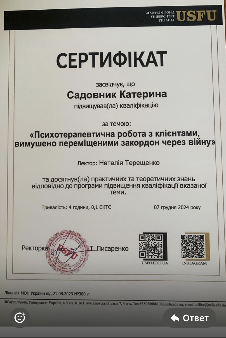 - Сертифікат Психологічна робота з клієнтами вимушено переміщеними закордон через війну з 2024 року