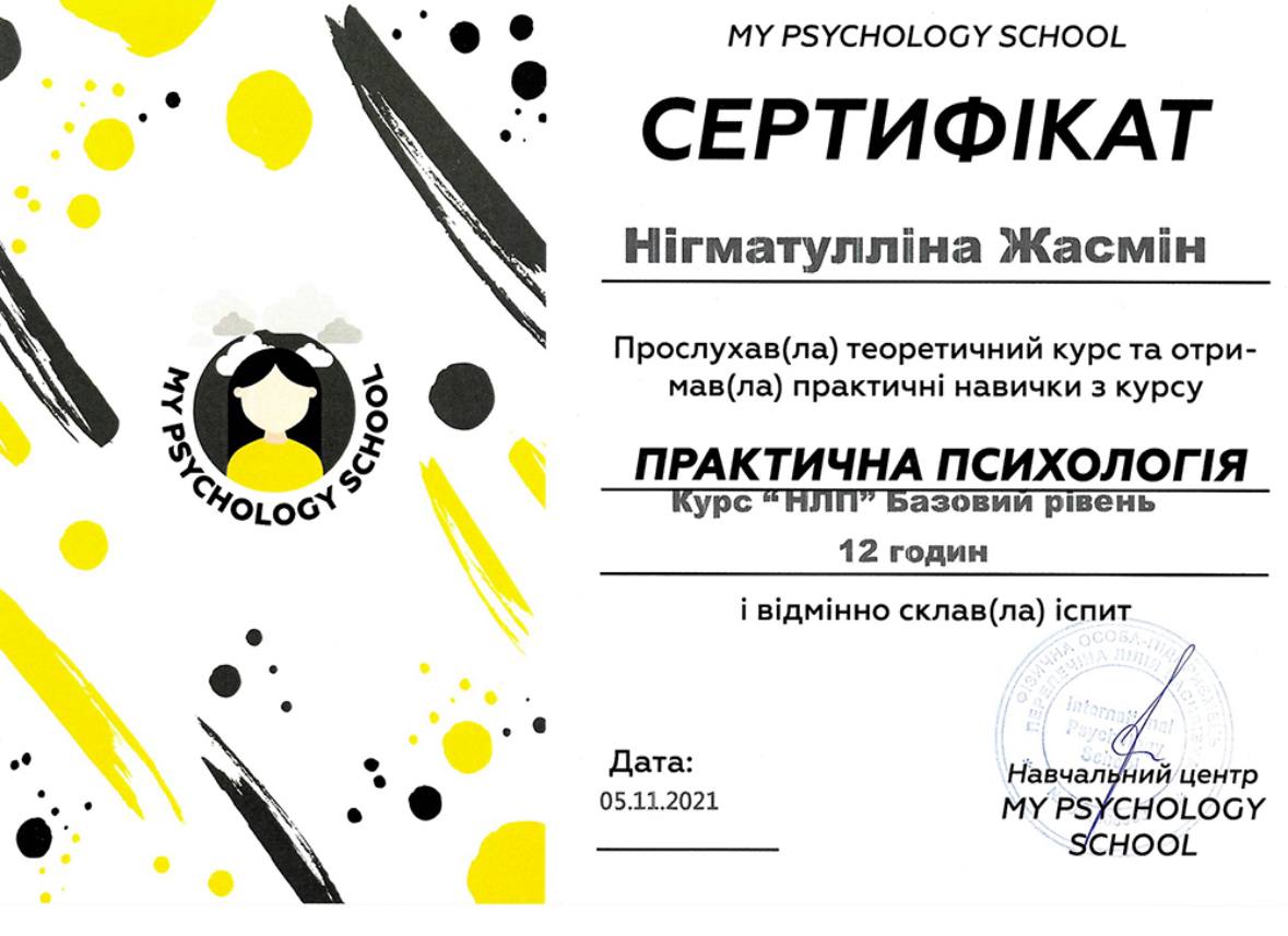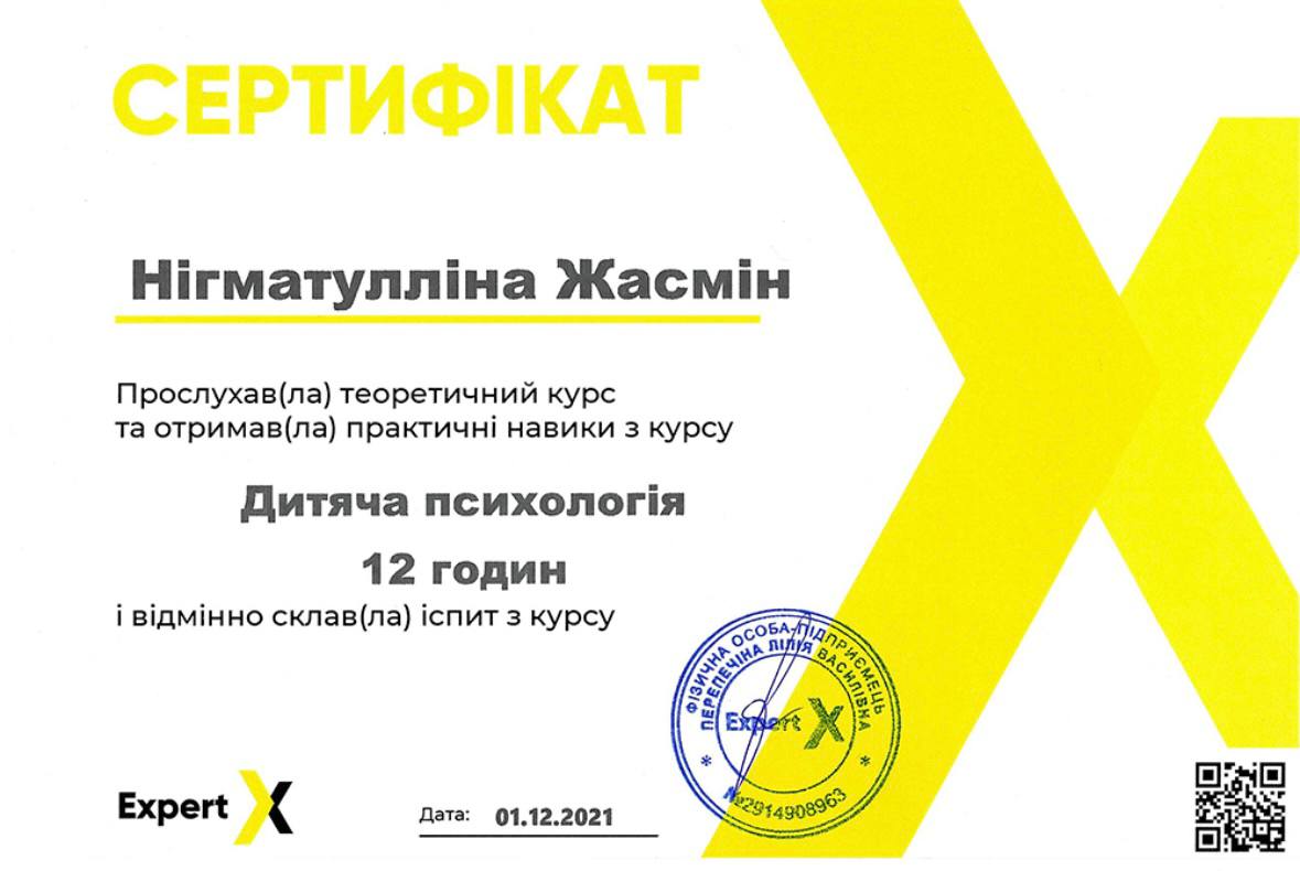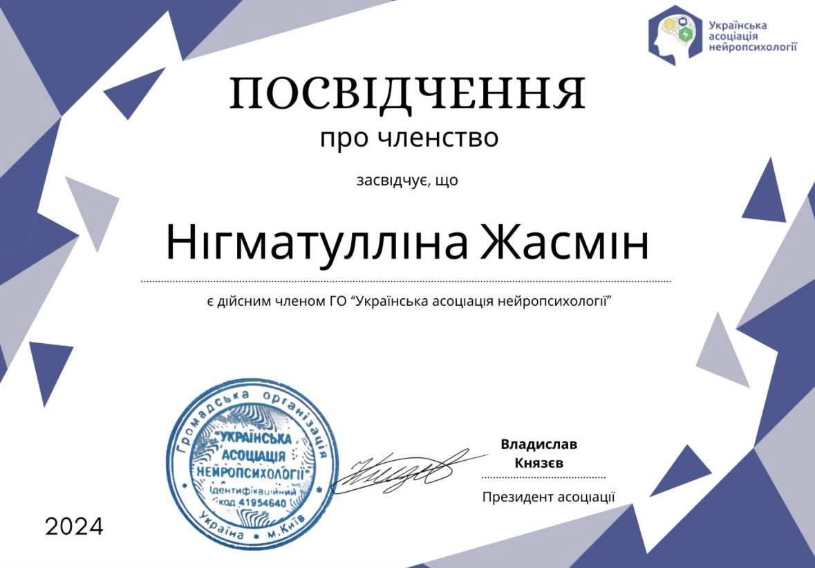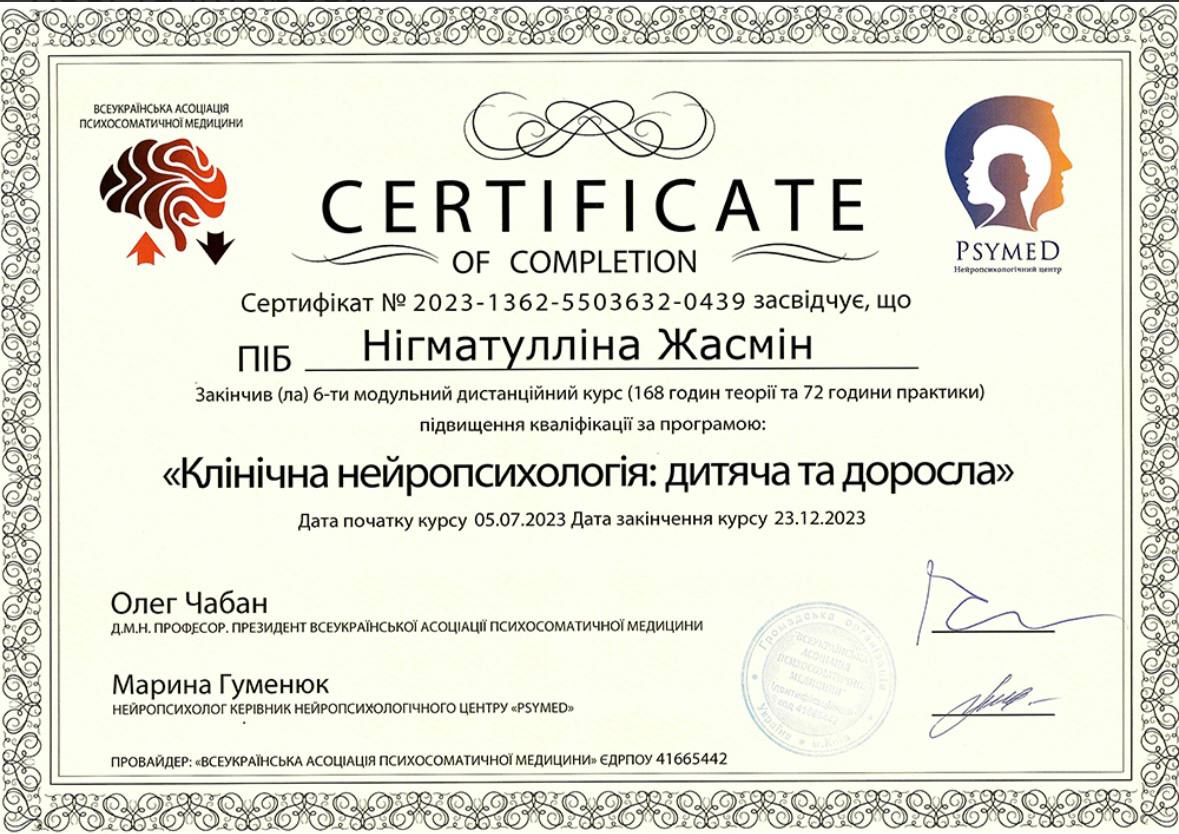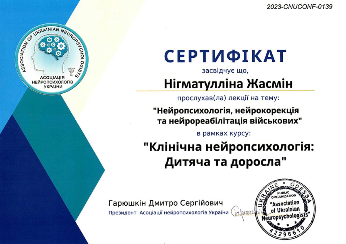 - Сертифікат "Клінічна нейропсихологія: Дитяча та доросла" з 2021 року