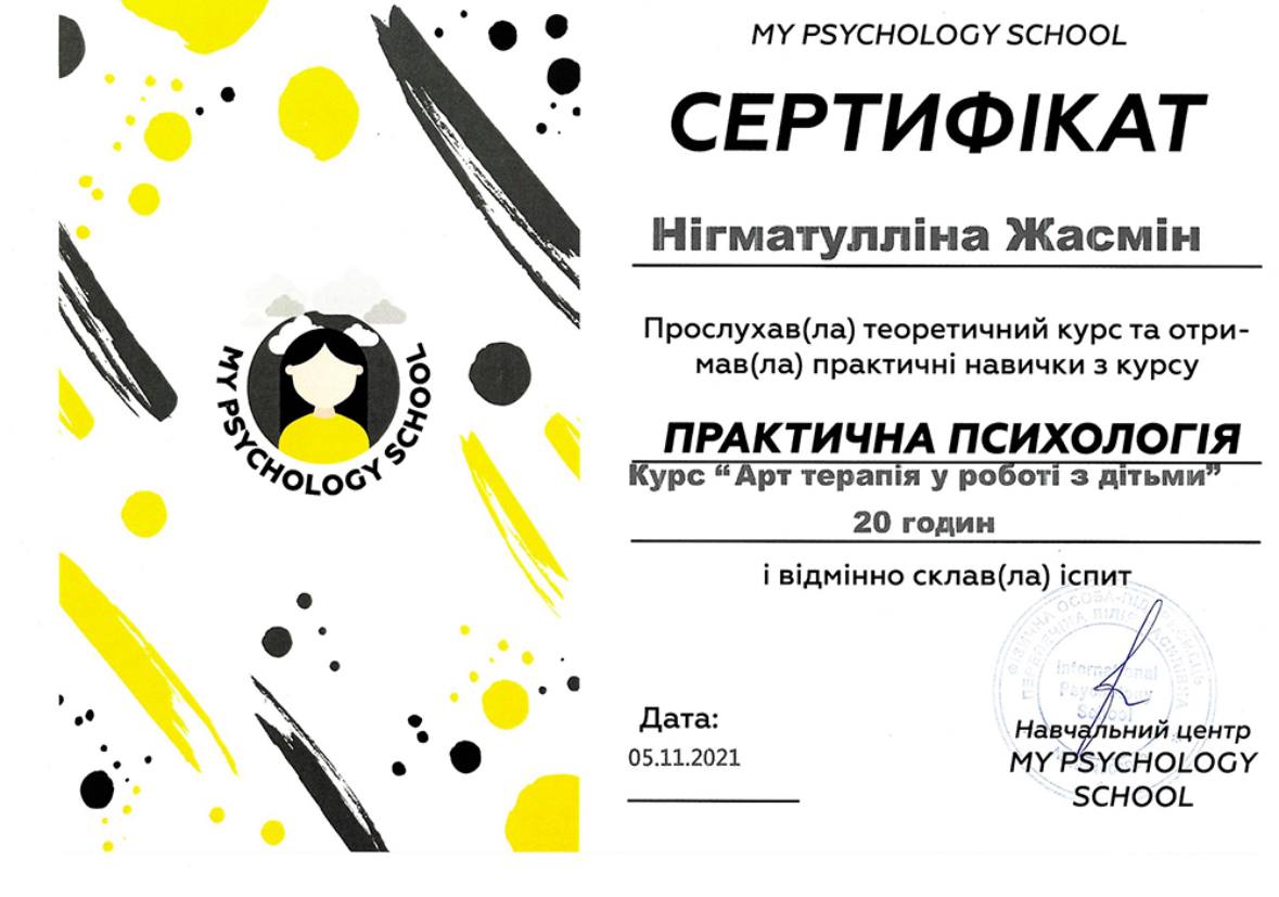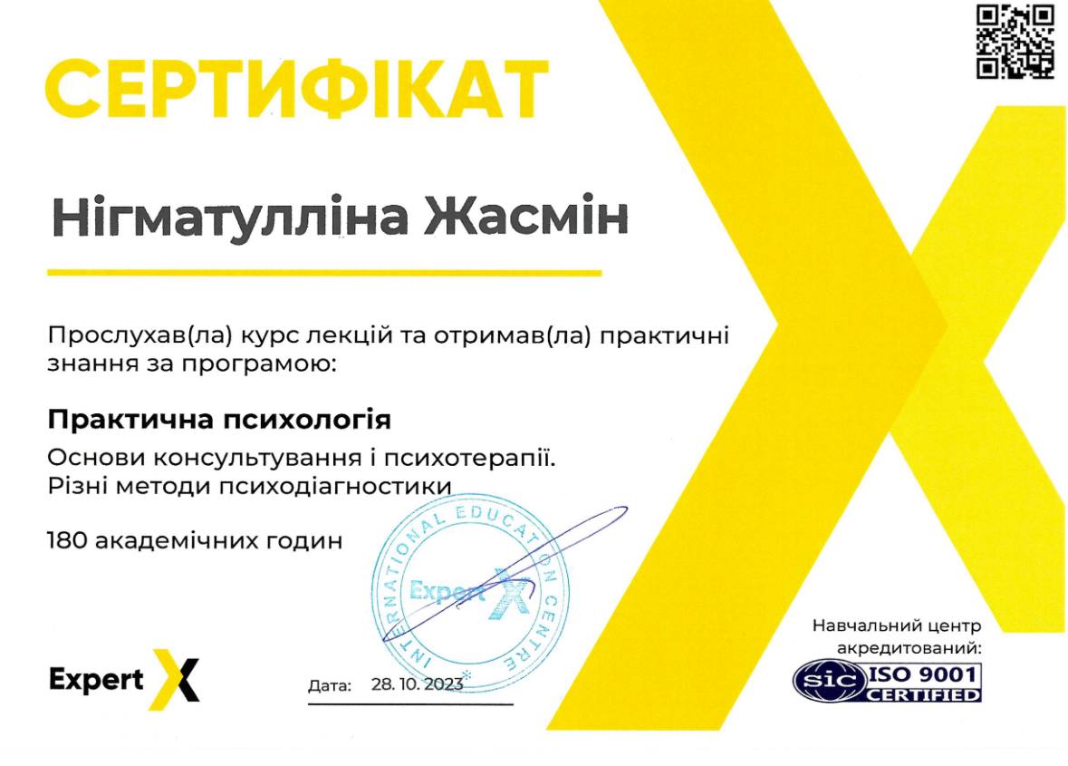 - Сертифікат Основи консультування і психотерапії. Різні методи психодіагностики з 2023 року