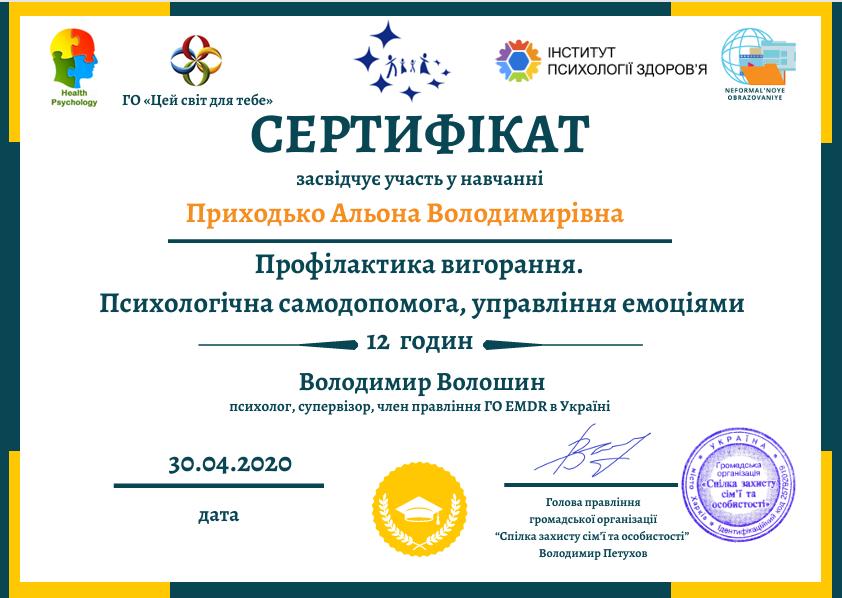 - Сертифікат Профілактика вигорання. Психологічна самодопомога, управління емоціями. з 2020 року