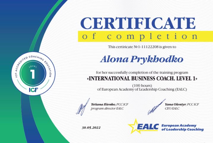 - Сертифікат Бізнес-коуч міжнародного рівня, European Academy of Leadership Coaching. з 2022 року