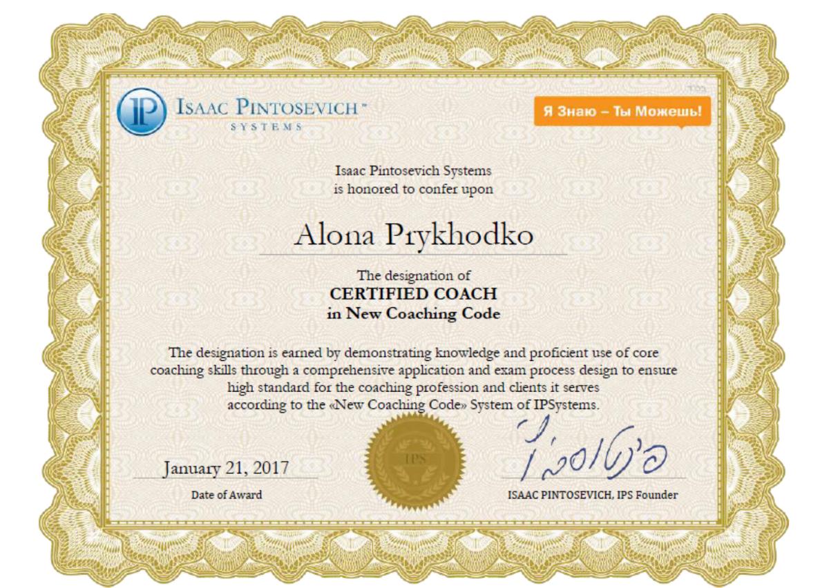 - Сертифікат Коучи нового коду, Isaac Pintosevich Systems з 2017 року