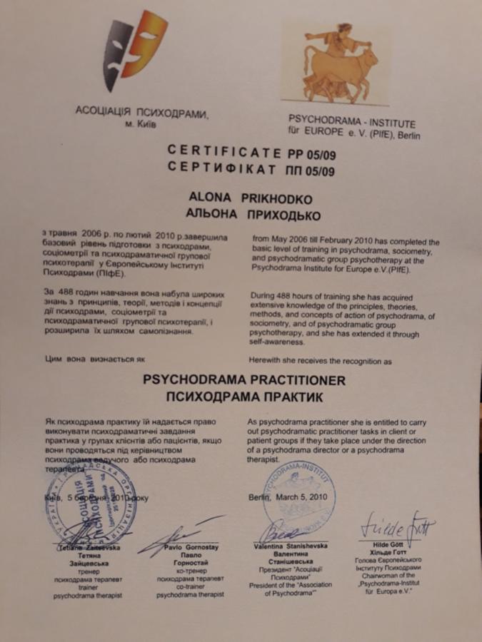 - Школа психодрами. Ступінь психодрама-практика. в 2010