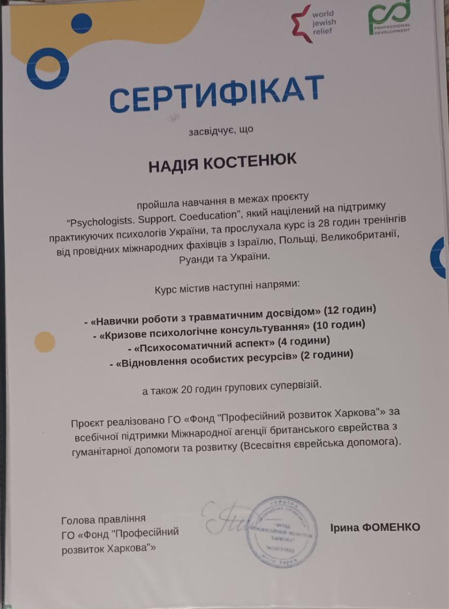 Сертифікат сертифікат про підтримку практикуючих психологів (навчання в межах проекту "Psychologists. Support. Coeducation") з 2022 року