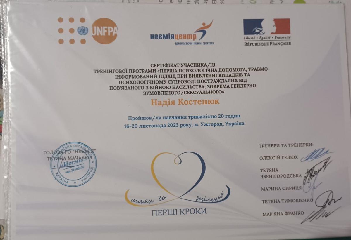 Сертифікат Травмоінформований підхід при виявленні випадків та психологічному супроводі постраждалих від пов'язаного з війною насильства, зокрема гендернозумовленого\сексуального з 2023 року