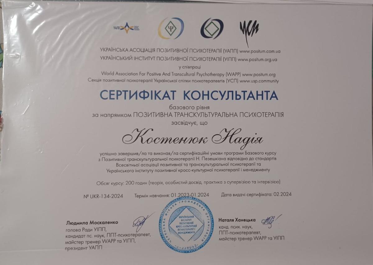 Сертифікат Сертифікат консультанта БАЗОВОГО рівня за напрямком ПОЗИТИВНА ТРАНСКУЛЬТУРАЛЬНА ПСИХОТЕРАПІЯ з 2024 року