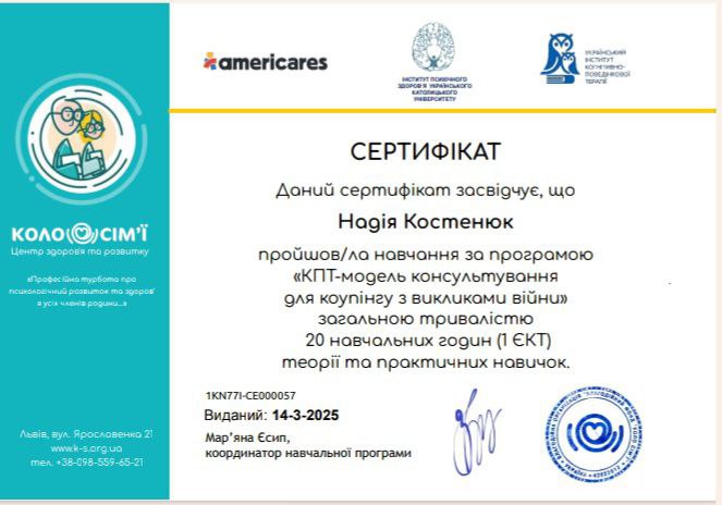 Сертифікат КПТ-модель консультування для коупінгу з викликами війни з 2025 року