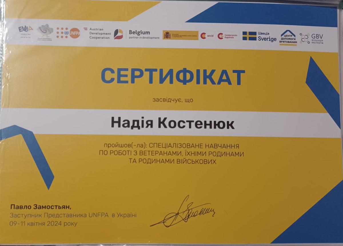 Сертифікат СПЕЦІАЛІЗОВАНЕ НАВЧАННЯ ПО РОБОТІ З ВЕТЕРАНАМИ, ІЇХНІМИ РОДИНАМИ ТА РОДИНАМИ ВІЙСЬКОВИХ з 2024 року