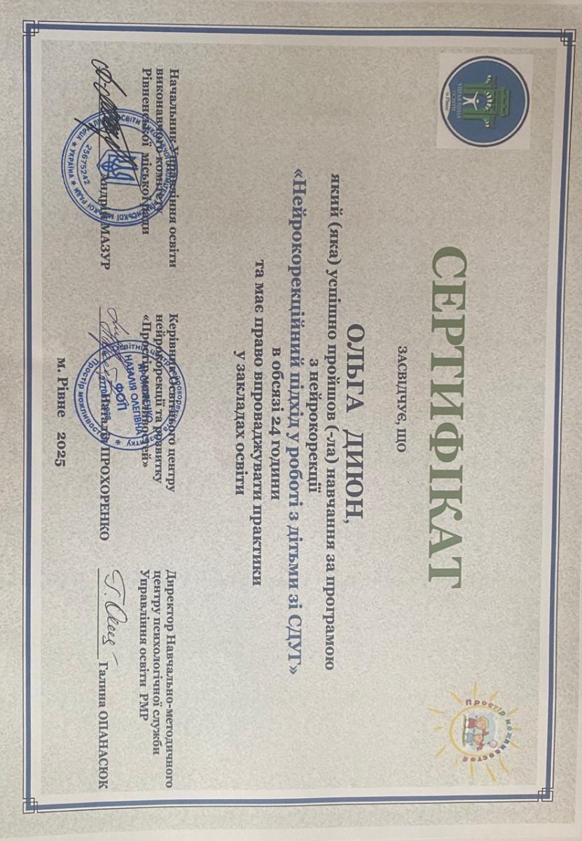 - Сертифікат Нейрокорекційний підхід у роботі з дітьми зі СДУГ з 2025 року