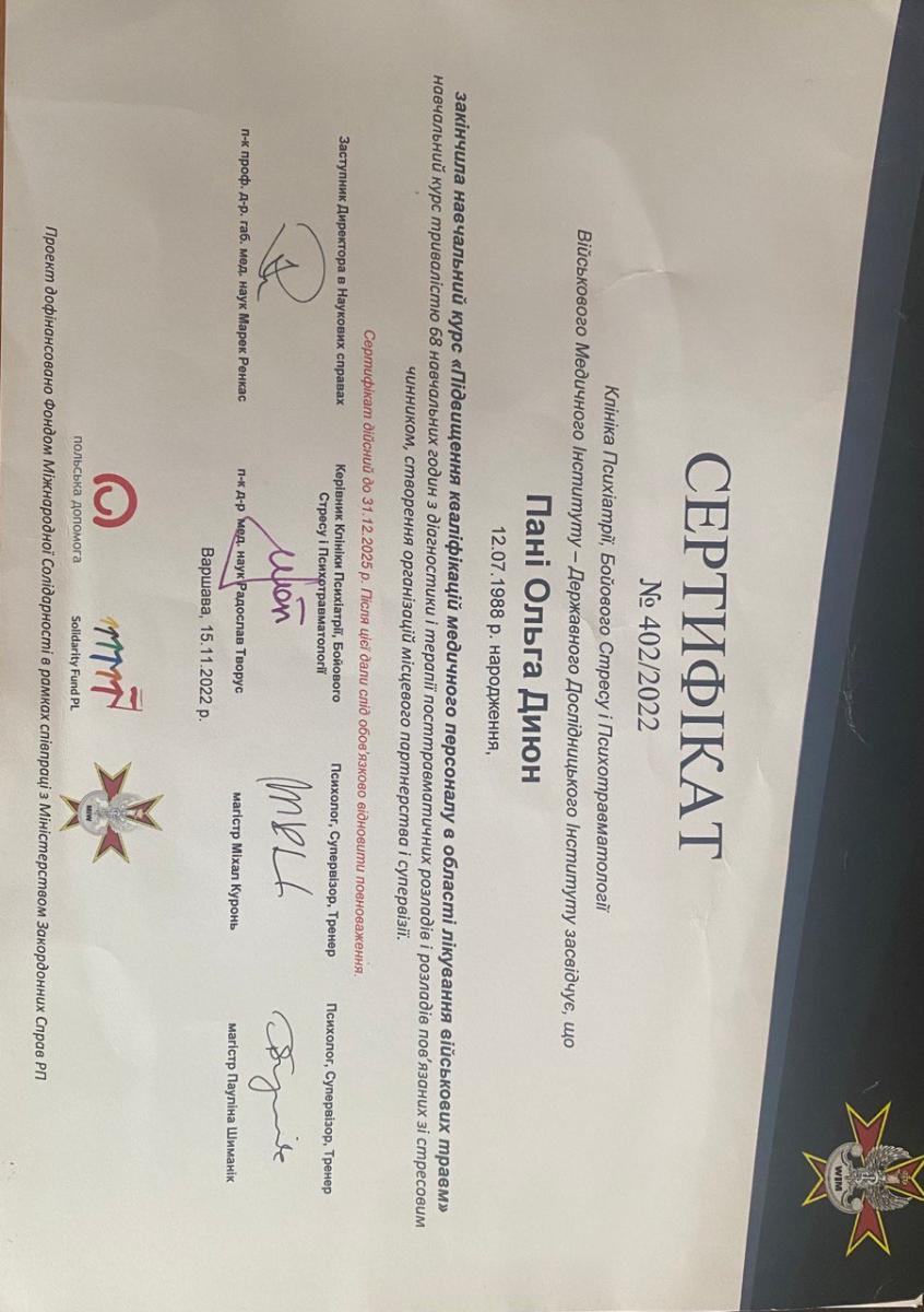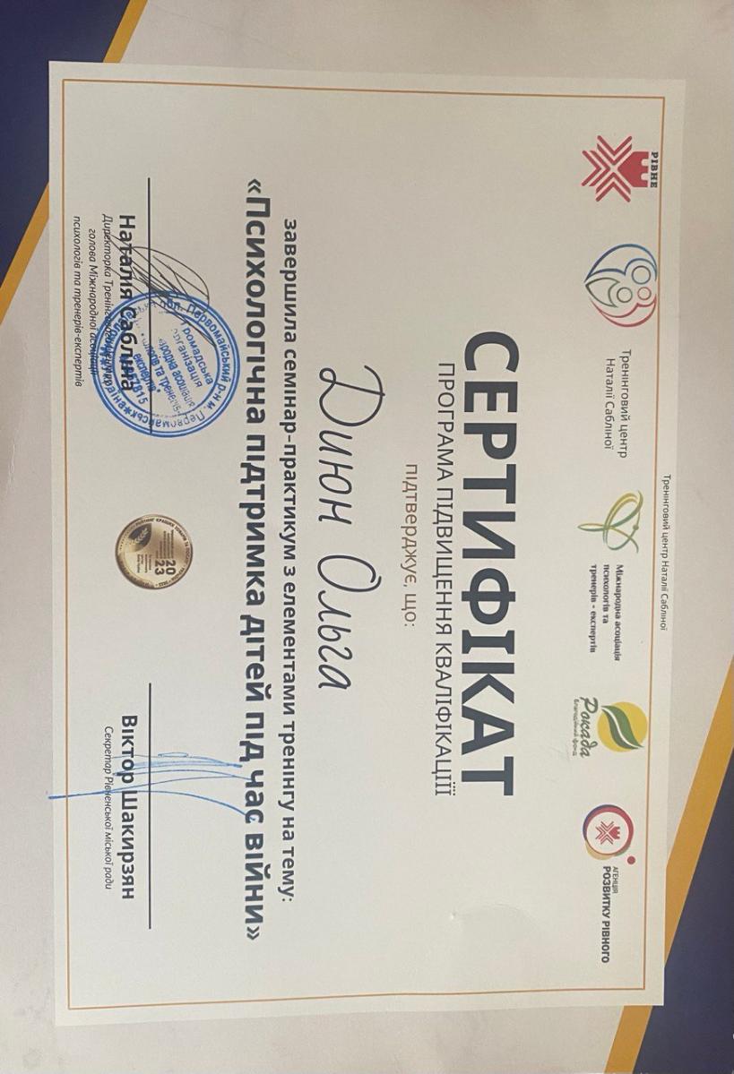 - Сертифікат Психологічна підтримка дітей під час війни з 2023 року
