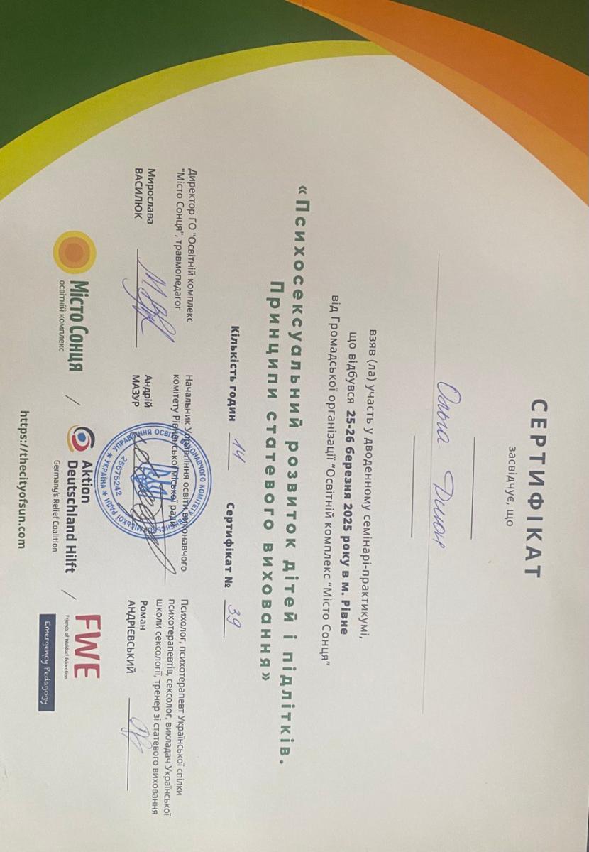 - Сертифікат Психосексуальний розвиток дітей і підлітків. принципи статевого виховання. з 2025 року