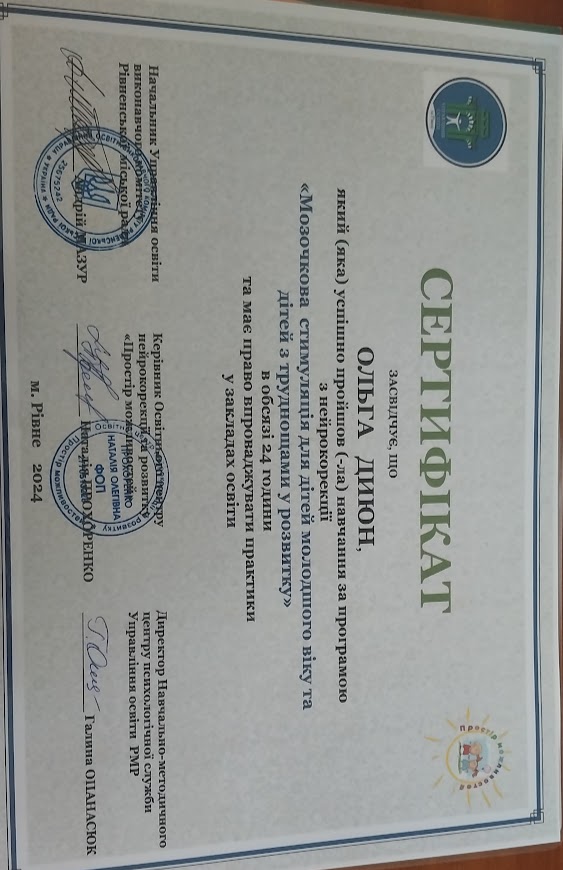 - Сертифікат Мозочкова стимуляція для дітей молодшого віку та дітей з труднощами у розвитку. з 2024 року