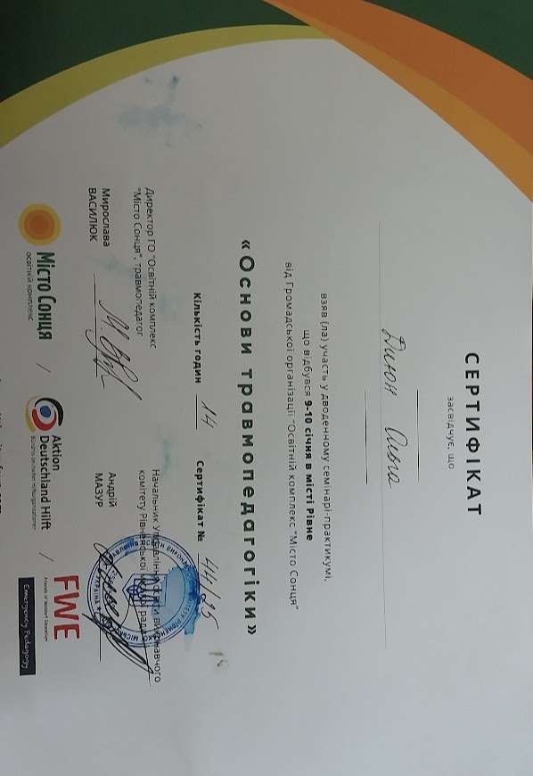 - Сертифікат Основи травмапедагогіки з 2025 року