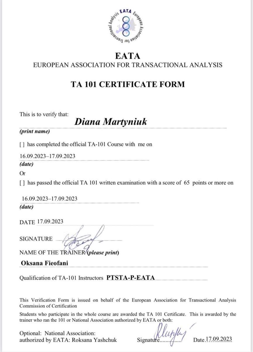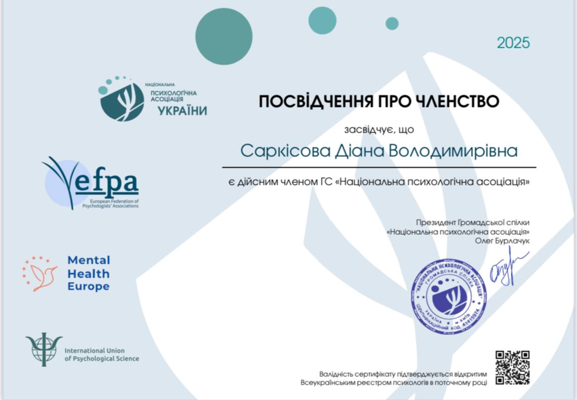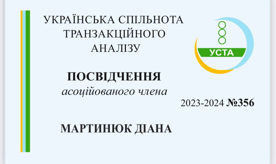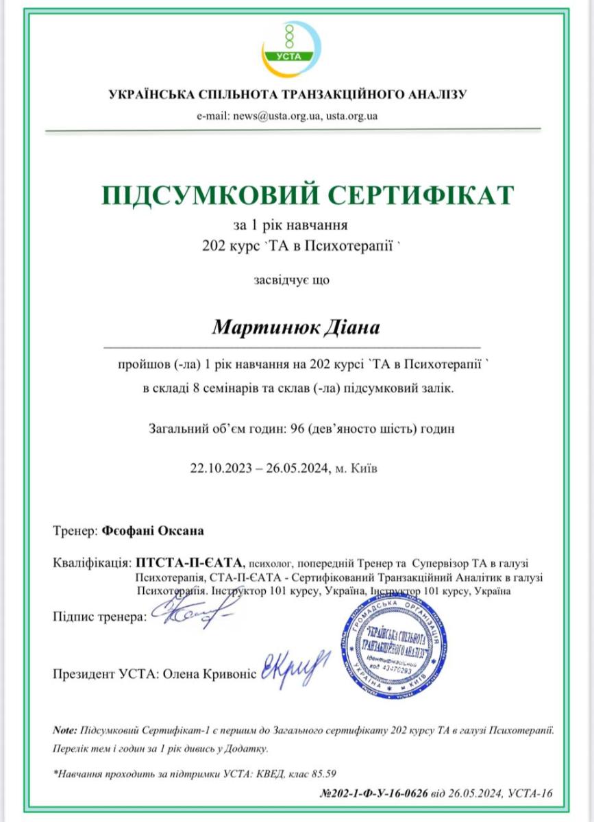 Привіт! Я маю понад 5 років досвіду роботи у сфері психологічного консультування та психотерапії. Я - той фахівець, поруч з яким можна говорити про болюче без остраху. У своїй роботі я створюю безпечний терапевтичний простір, де кожен клієнт може бути почутим та безумовно прийнятим. До мене звертаються з такими проблемами: тривога, нав'язливі думки, страх невизначеності; депресивні стани, апатія, емоційне виснаження; робота із травмою, опрацювання травматичного досвіду; робота із втратою, ускладнена скорбота; проблеми самооцінки, невпевненість у собі, внутрішня критика; складності в комунікації, міжособистісних стосунках; складності в робочих стосунках, самореалізації; професійне емоційне вигорання. Я є сертифікованим членом професійних психологічних асоціацій (НПА, УПА, УСТА, ЄАТА, EFPA, IUPS), входжу до реєстру психологів, що залучаються до кримінальних проваджень та безперервно підвищую свою кваліфікацію. Працюю в методі транзакційного аналізу. Робота зі мною - це завжди турботливо, екологічно та ефективно. Запрошую знайти вихід: ВАШ, а не правильний.