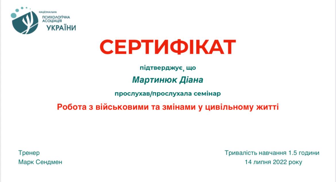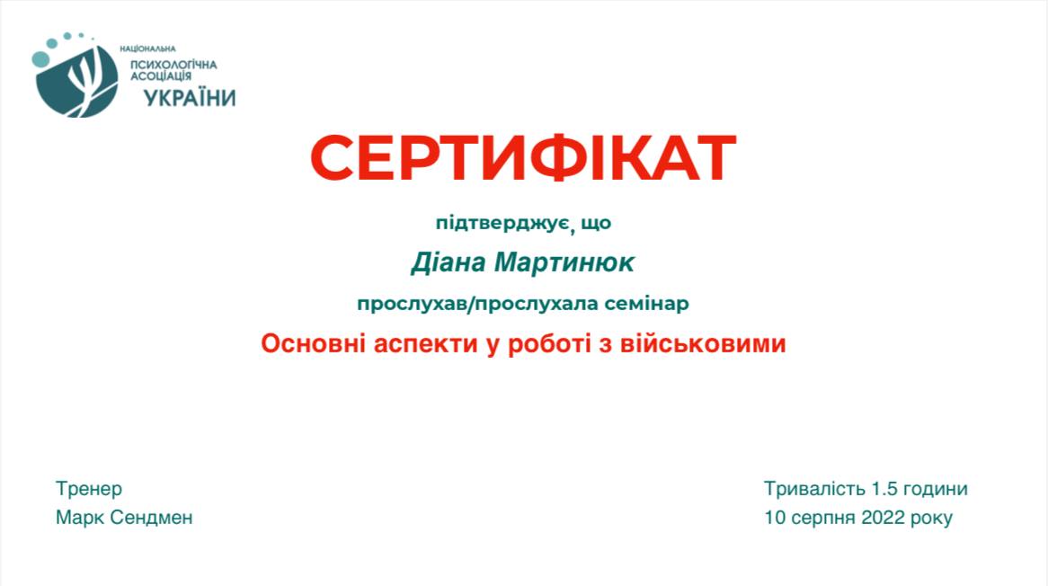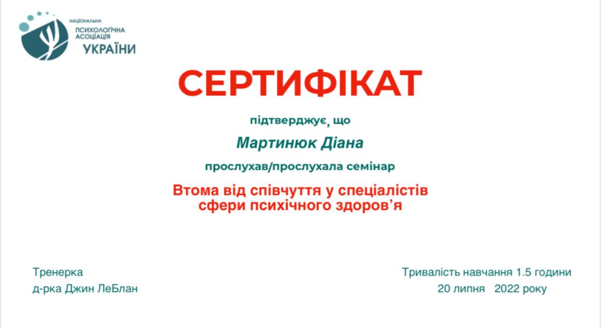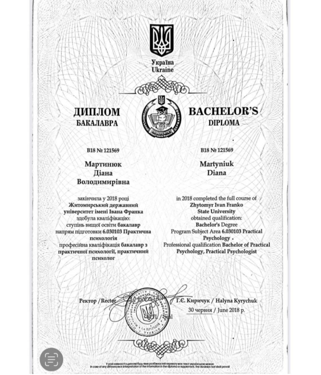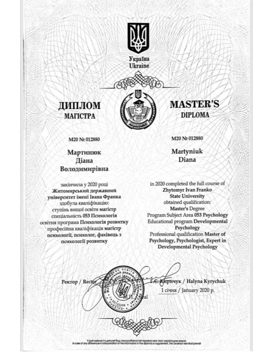 Привіт! Я маю понад 5 років досвіду роботи у сфері психологічного консультування та психотерапії. Я - той фахівець, поруч з яким можна говорити про болюче без остраху. У своїй роботі я створюю безпечний терапевтичний простір, де кожен клієнт може бути почутим та безумовно прийнятим. До мене звертаються з такими проблемами: тривога, нав'язливі думки, страх невизначеності; депресивні стани, апатія, емоційне виснаження; робота із травмою, опрацювання травматичного досвіду; робота із втратою, ускладнена скорбота; проблеми самооцінки, невпевненість у собі, внутрішня критика; складності в комунікації, міжособистісних стосунках; складності в робочих стосунках, самореалізації; професійне емоційне вигорання. Я є сертифікованим членом професійних психологічних асоціацій (НПА, УПА, УСТА, ЄАТА, EFPA, IUPS), входжу до реєстру психологів, що залучаються до кримінальних проваджень та безперервно підвищую свою кваліфікацію. Працюю в методі транзакційного аналізу. Робота зі мною - це завжди турботливо, екологічно та ефективно. Запрошую знайти вихід: ВАШ, а не правильний.