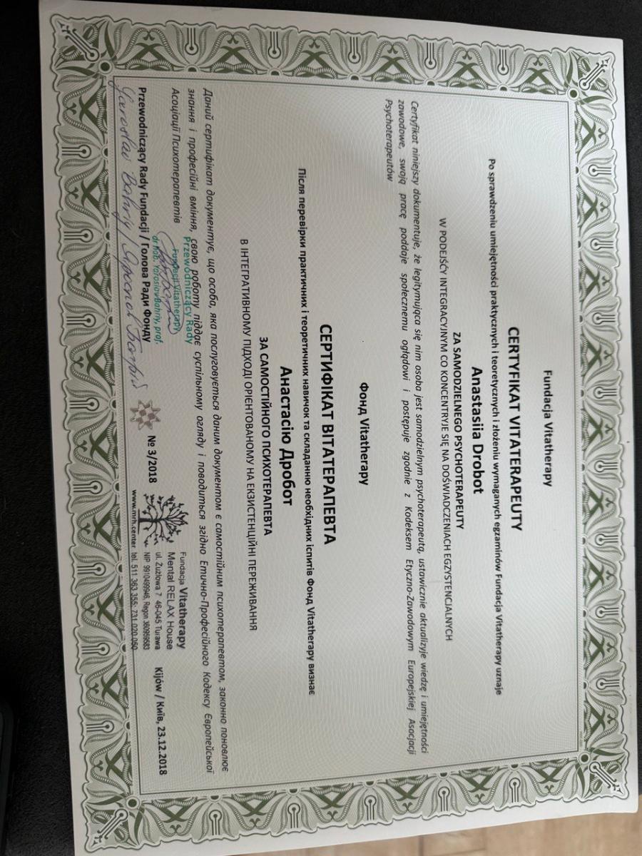 - Сертифікат Сертифікат Vitaterapeuty з 2018 року