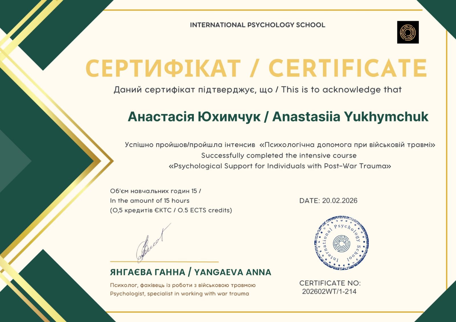 - Сертифікат Психологічна допомога при військовій травмі з 2026 року