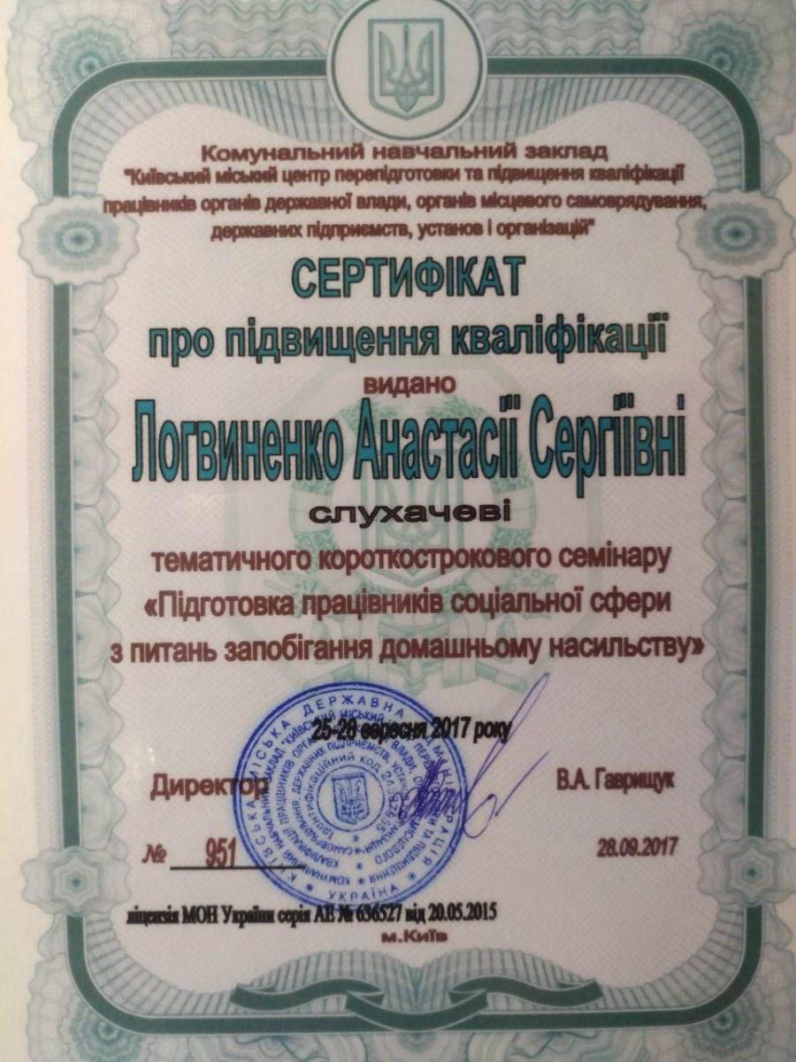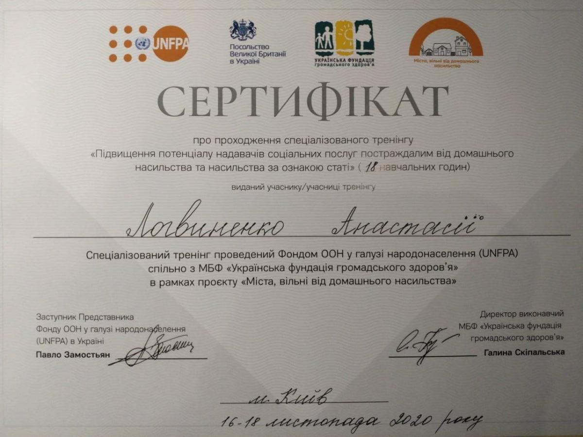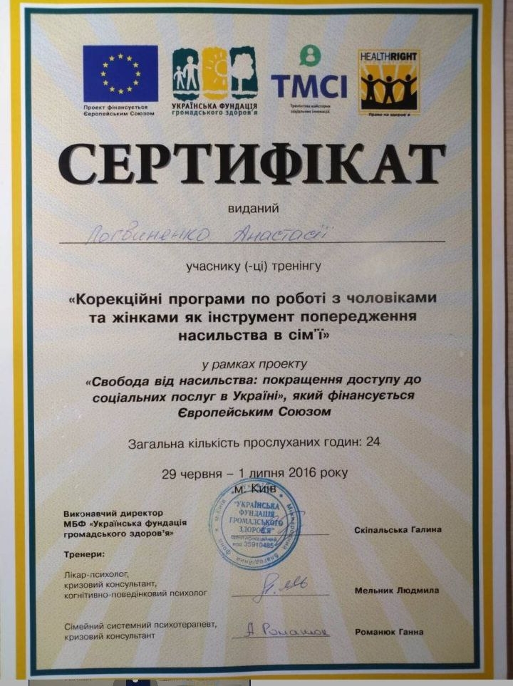 - Сертифікат Корекційні програми по роботі з чоловіками та жінками, як інструмент попередження насильства в сім'ї з 2016 року