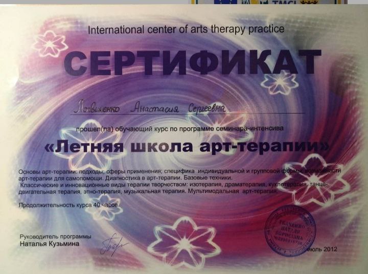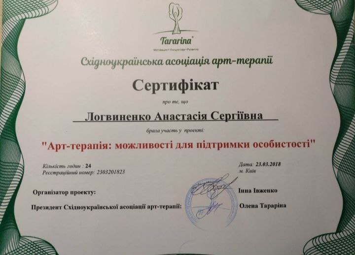 - Сертифікат Арт - терапія: можливості для підтримки особистості з 2018 року