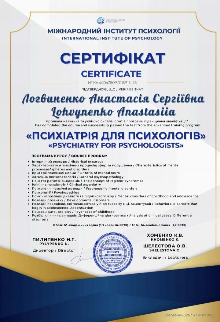 Мене звати Анастасія, я — практичний психолог. У 2014 році я завершила навчання в Міжнародному інституті глибинної психології. Відтоді працюю з людьми, які шукають себе, долають кризи, живуть із внутрішньою тривогою, втомою, болем втрати чи просто — з відчуттям, що "щось не так, а що — неясно".
