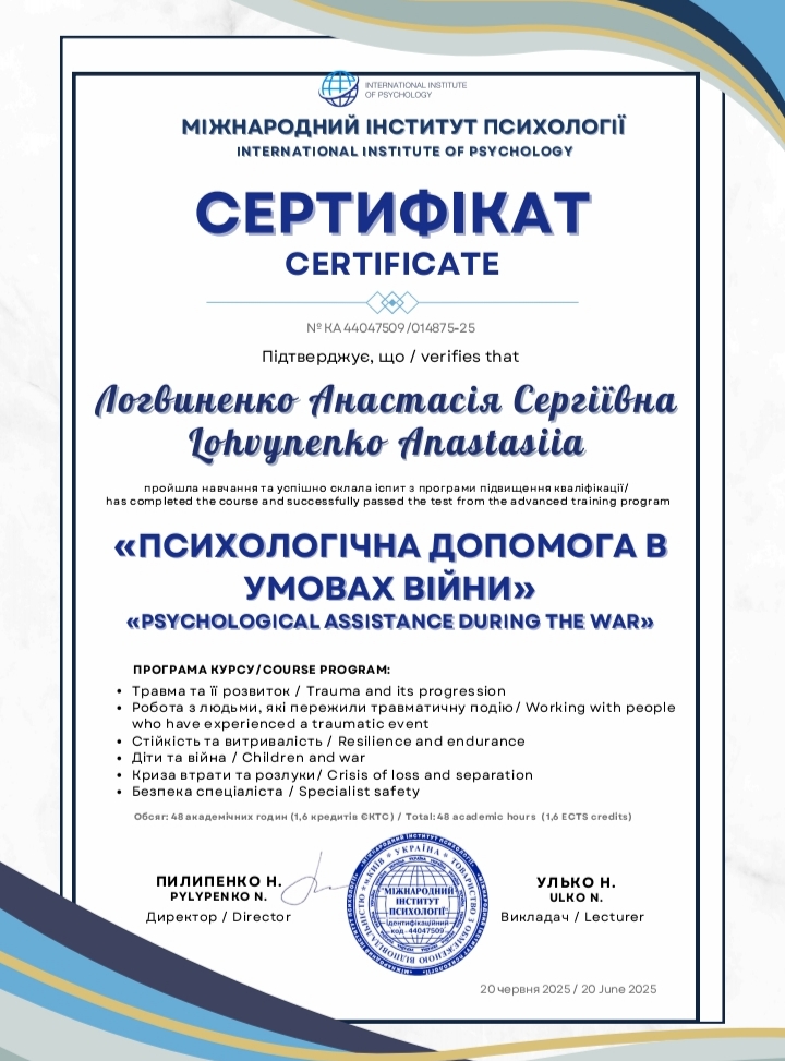 Мій перший досвід був у Київському міському центрі соціально-психологічної допомоги. Я зустрічалася з різними історіями — складними, заплутаними, але завжди живими. Це навчило мене бути уважною до найменших змін і дуже цінувати довіру, з якою люди діляться своїм внутрішнім світом.
