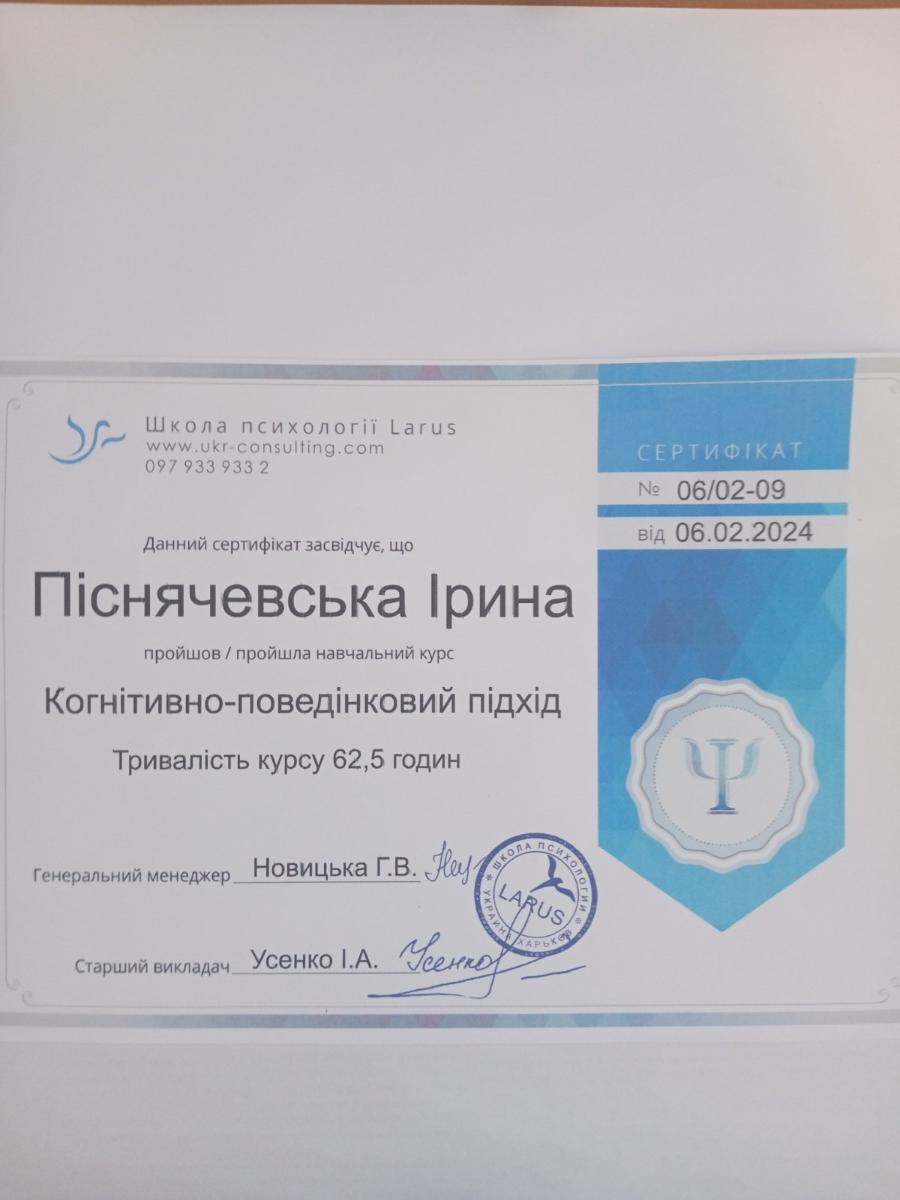 - Сертифікат Когнітивно-поведінковий підхід з 2024 року