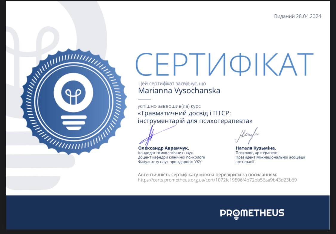 - Сертифікат Травматичний досвід і ПТСР, інструменти для психотерапевта з 2023 року