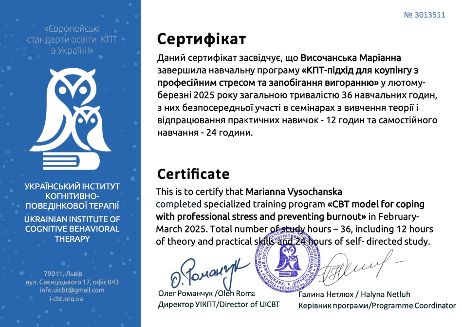 - Сертифікат КПТ підхід для коупінгу з професійним стресом та запобіганням емоційному вигоранню з 2025 року
