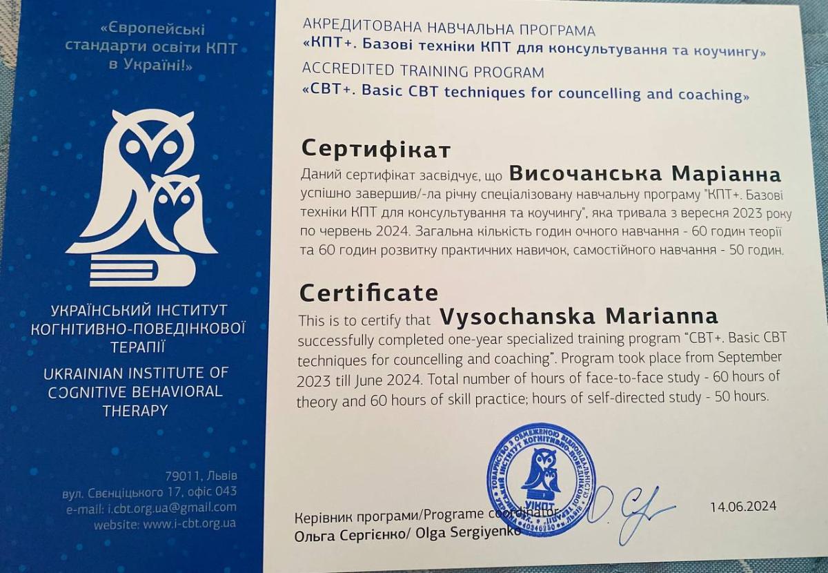 - Сертифікат базові техніки КПТ для консультування та коучингу з 2024 року