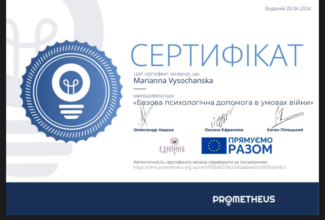 - Сертифікат Базова психологічна допомога в умовах війни з 2023 року