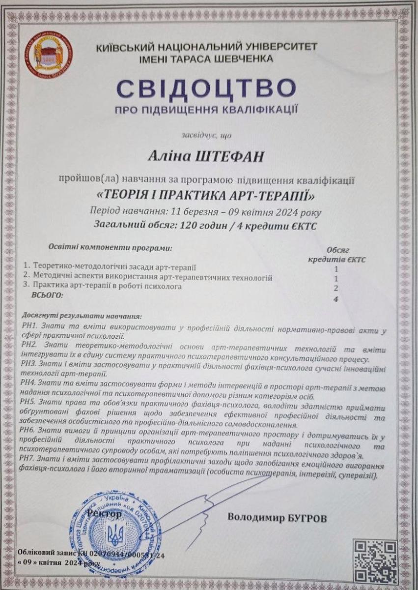 З 2024 - психотерапевтка, арт-терапевтка в проєкті реабілітації ветеранів гуманітарної організації DTCare “Компас героя”