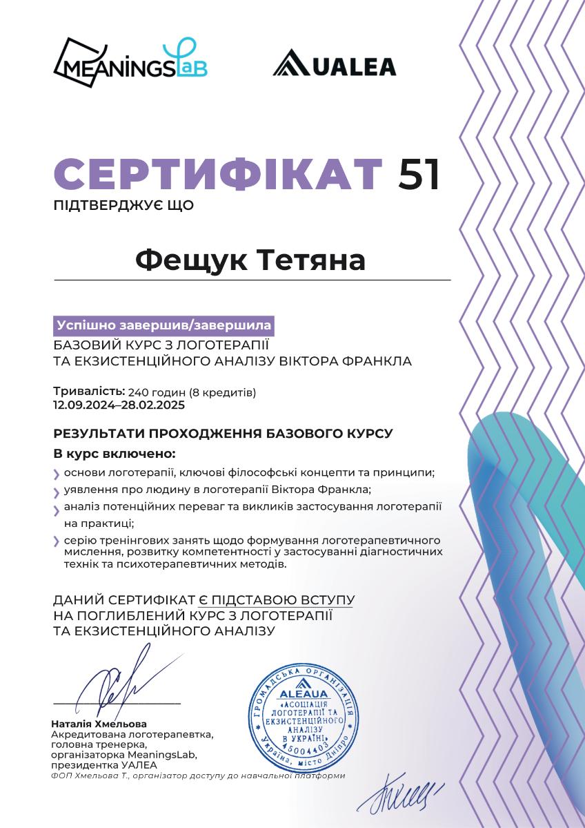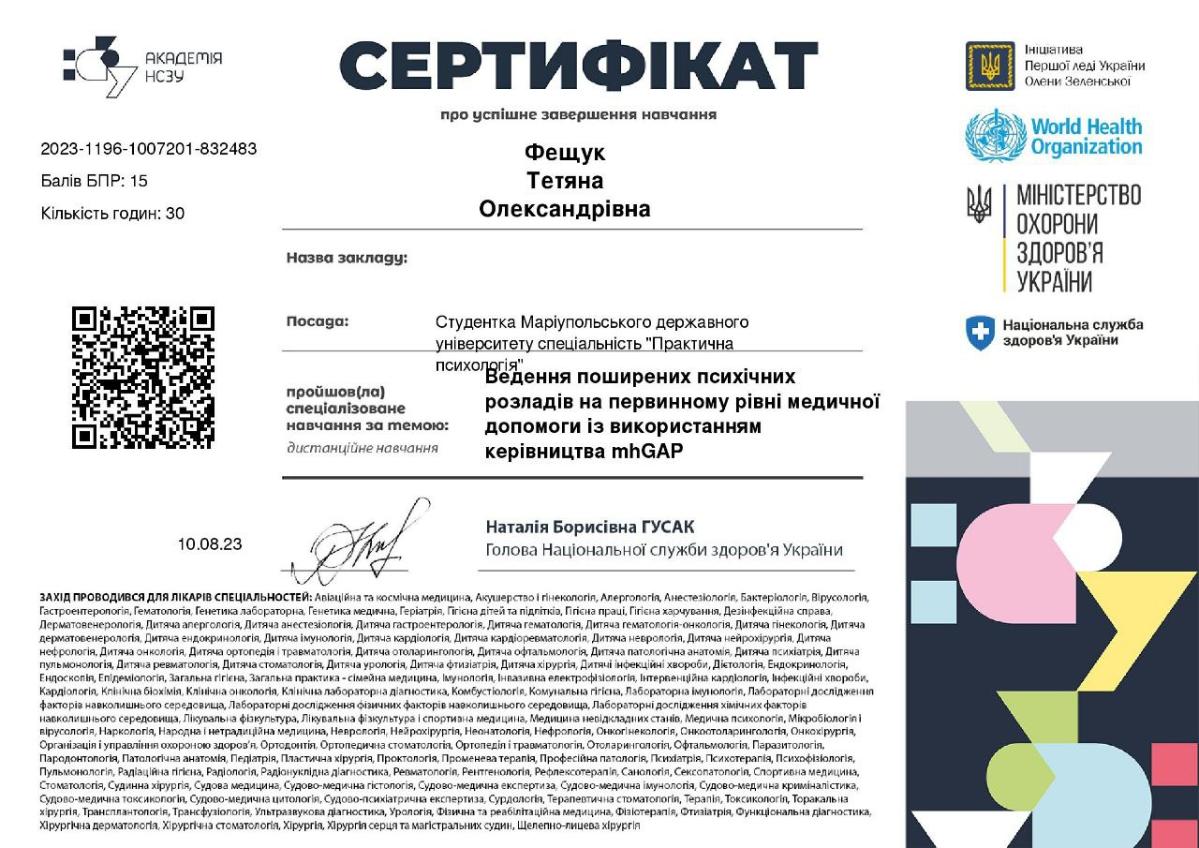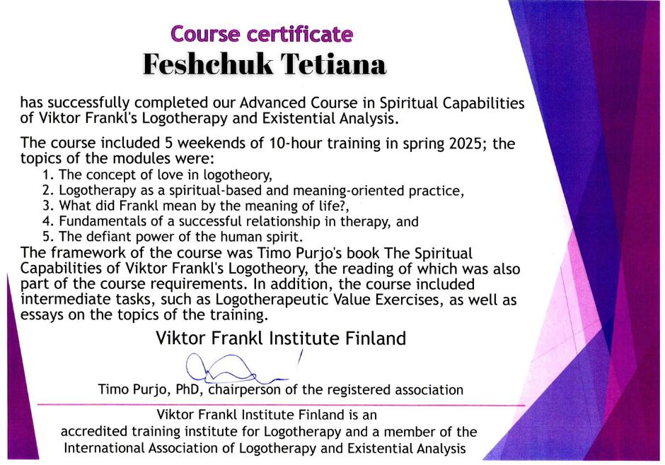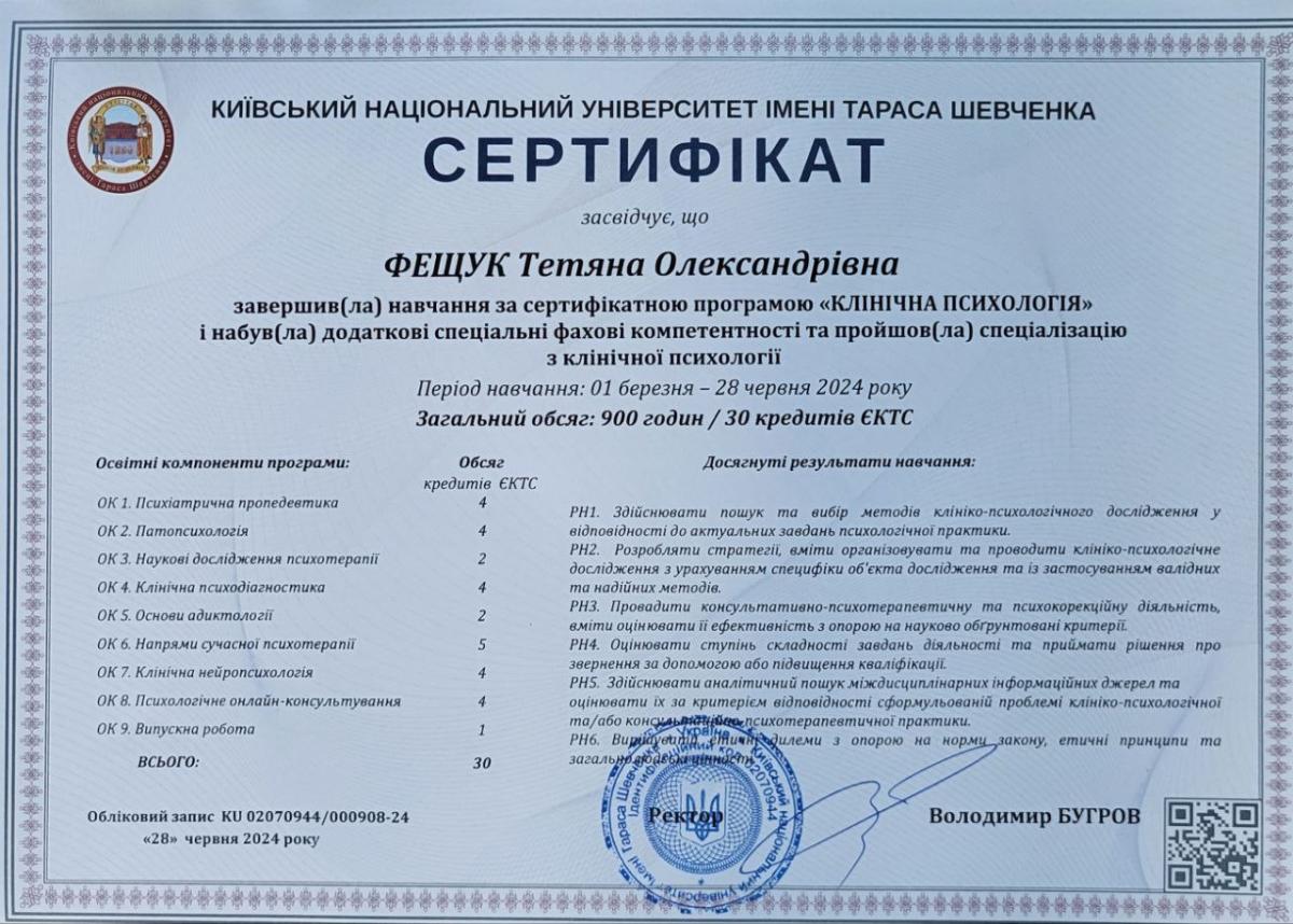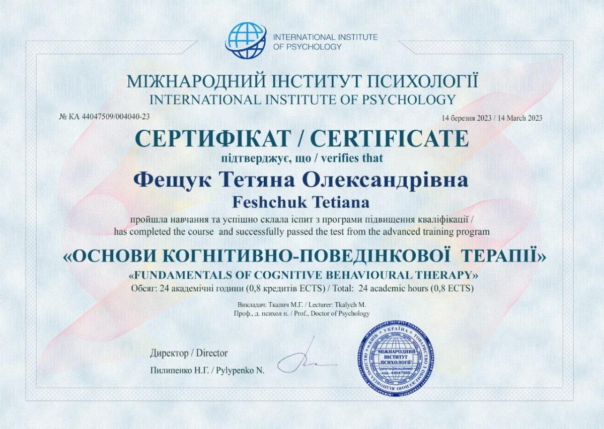Я практикуючий психолог з вищою освітою, маю диплом з відзнакою та сертифікати про проходження курсів підвищення кваліфікації. Мій досвід роботи охоплює різноманітні сфери психологічного консультування та підтримки.