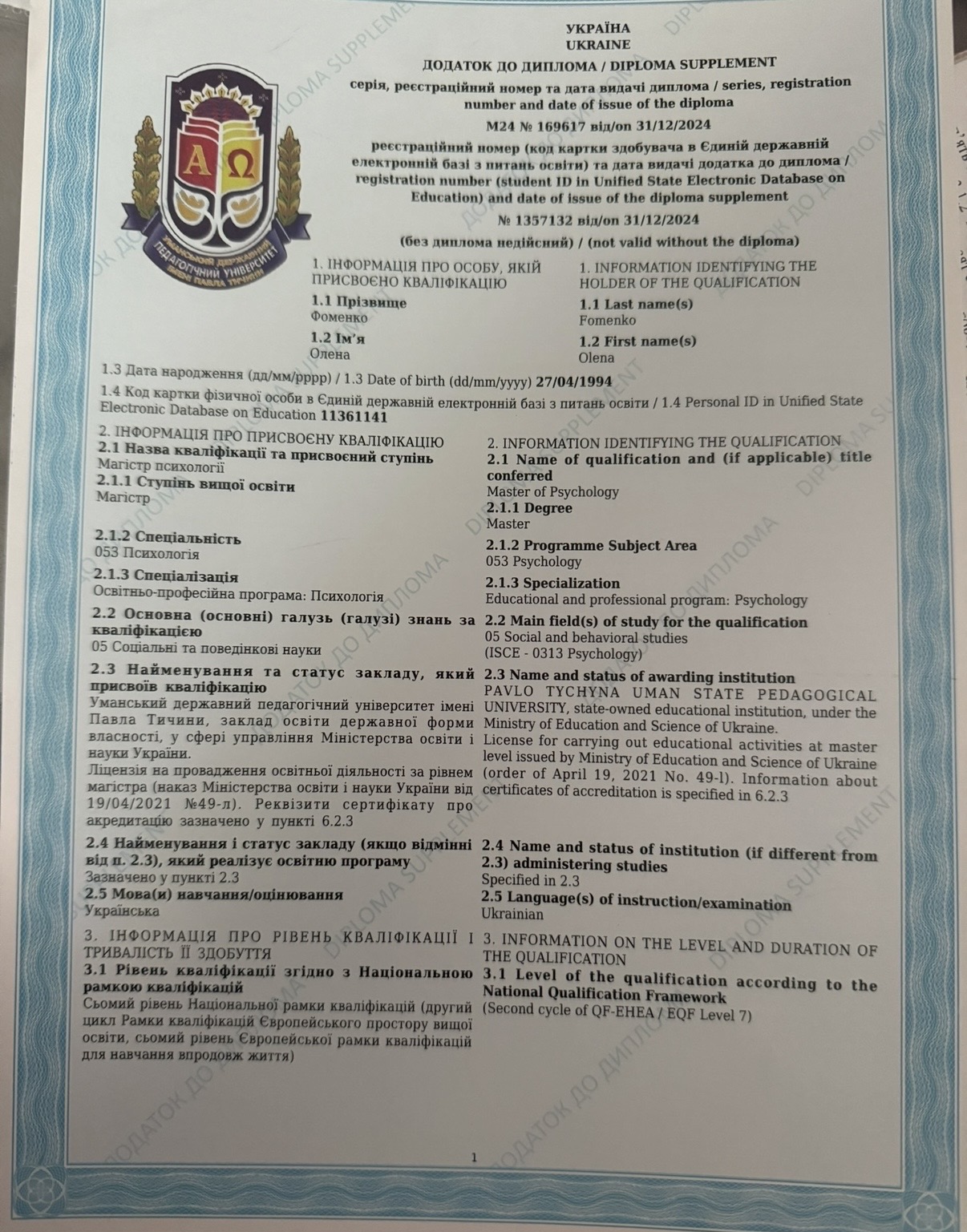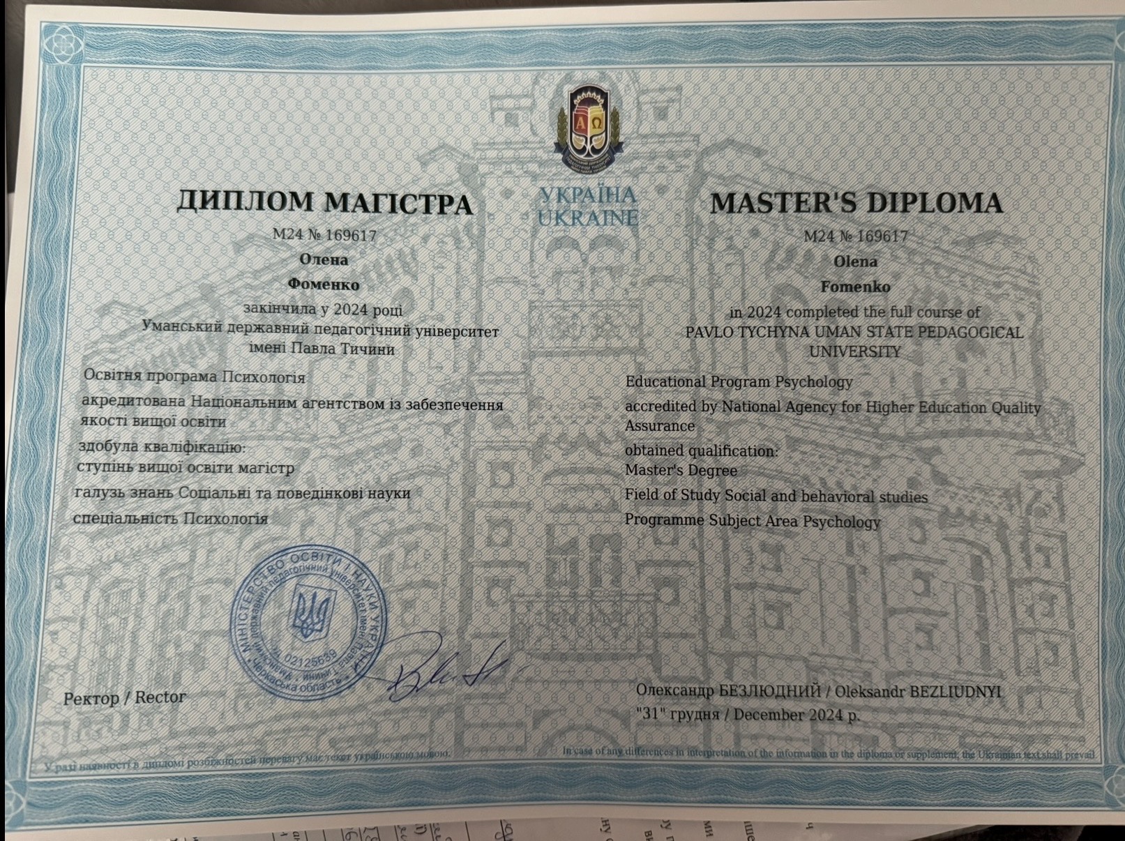 Олена Олександрівна - магістр психології, кваліфікований Базовий консультант з Позитивної психотерапії Вісбаденської академії ППТ, асоційована у World Association for Positive and Transcultural Psychotherapy (WAPP)