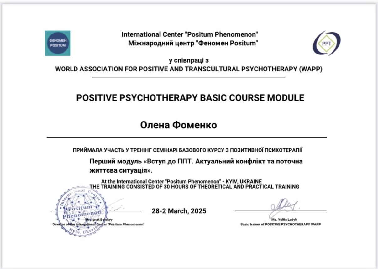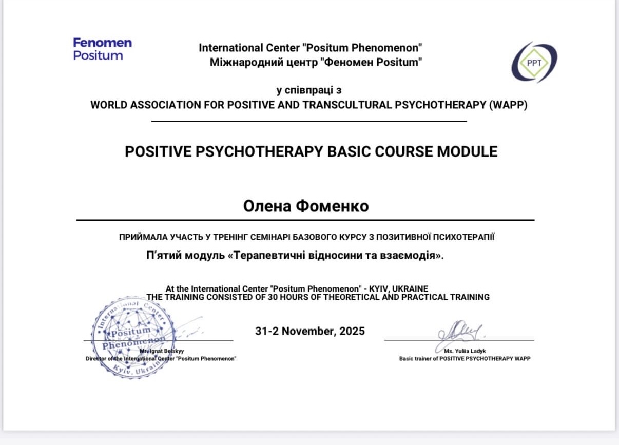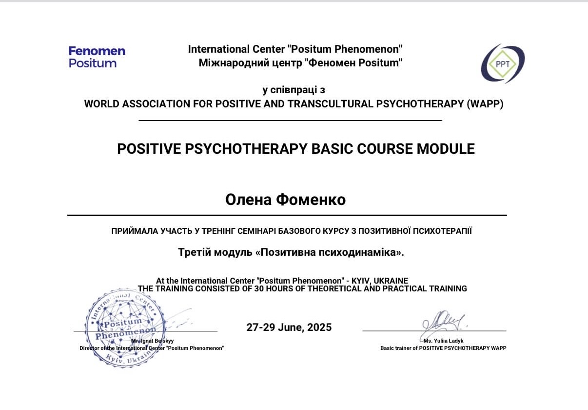 - Сертифікат Базовий консультант у методі позитивної психотерапії (Європейська сертифікація WAPP), Fenomen Positum з 2026 року